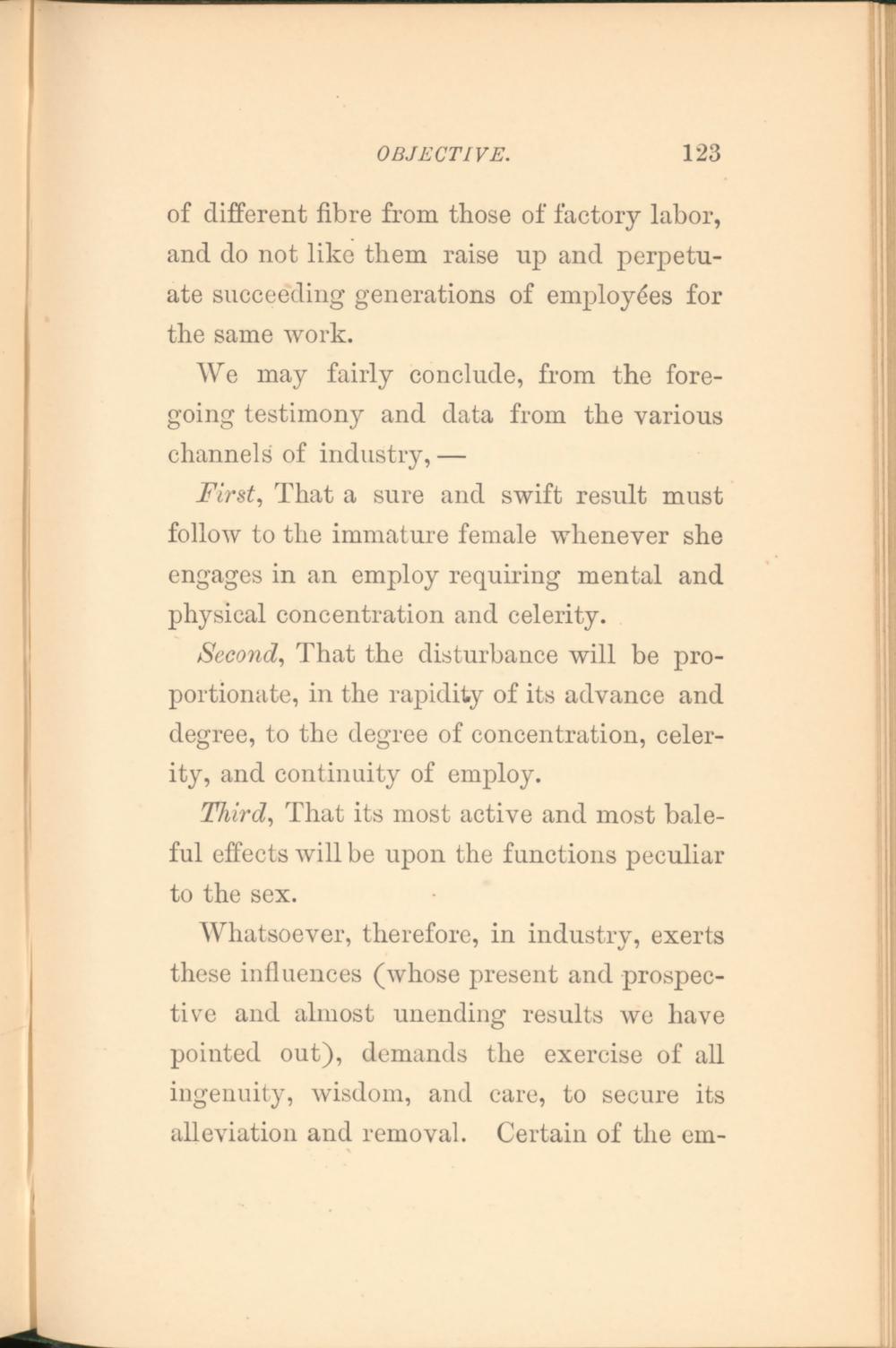 First, That a sure and swift result must follow to the immature female whenever she engages in an employ requiring mental and physical concentration and celerity.
