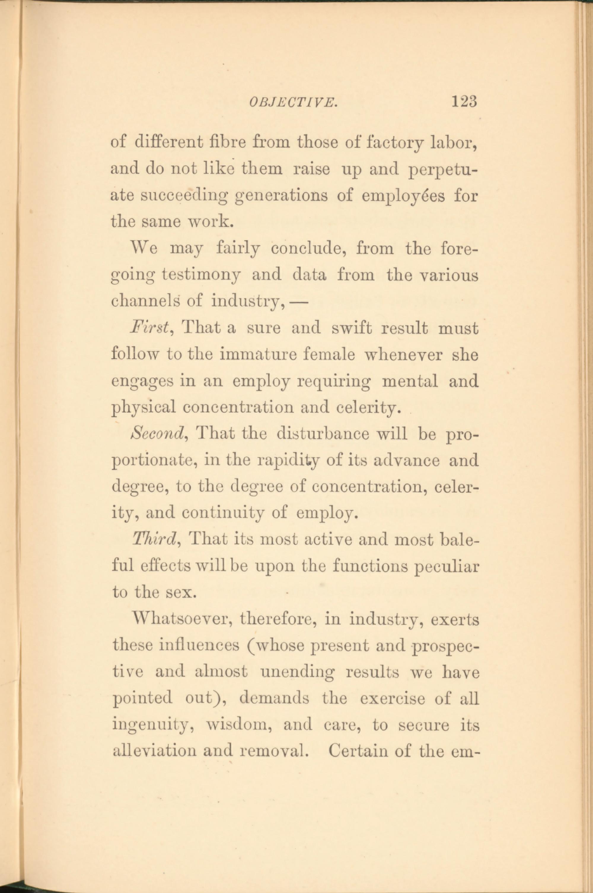 Whatsoever, therefore, in industry, exerts these influences (whose present and prospective and almost unending results we have pointed out), demands the exercise of all ingenuity, wisdom, and care, to secure its alleviation and removal. Certain of the em-
