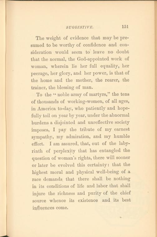 To the “ noble army of martyrs,” the tens of thousands of working-women, of all ages, in America to-day, who patiently and hopefully toil on year by year, under the abnormal burdens a disjointed and unreflective society imposes, I pay the tribute of my earnest sympathy, my admiration, and my humble effort. I am assured, that, out of the labyrinth of perplexity that has entangled the question of woman’s rights, there will sooner or later be evolved this certainty: that the highest moral and physical well-being of a race demands that there shall be nothing in its conditions of life and labor that shall injure the richness and purity of the chief source whence its existence and its best influences come.