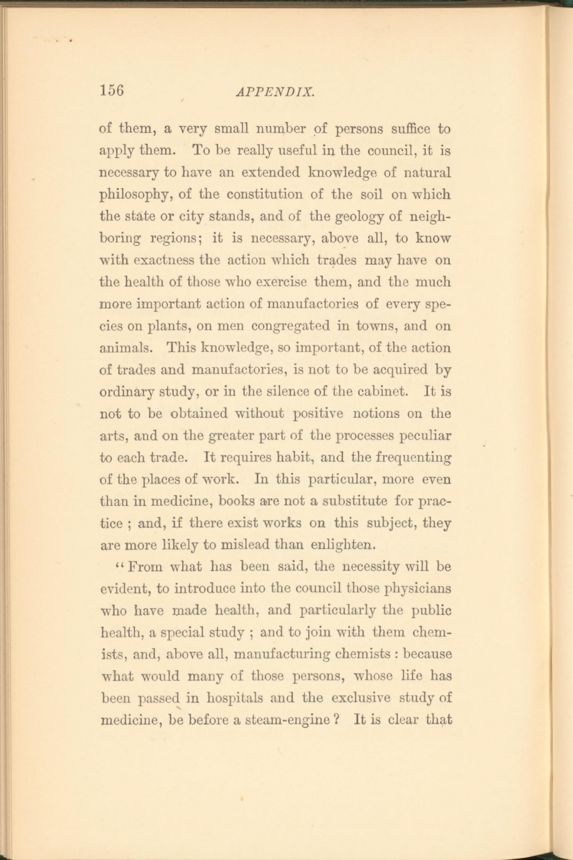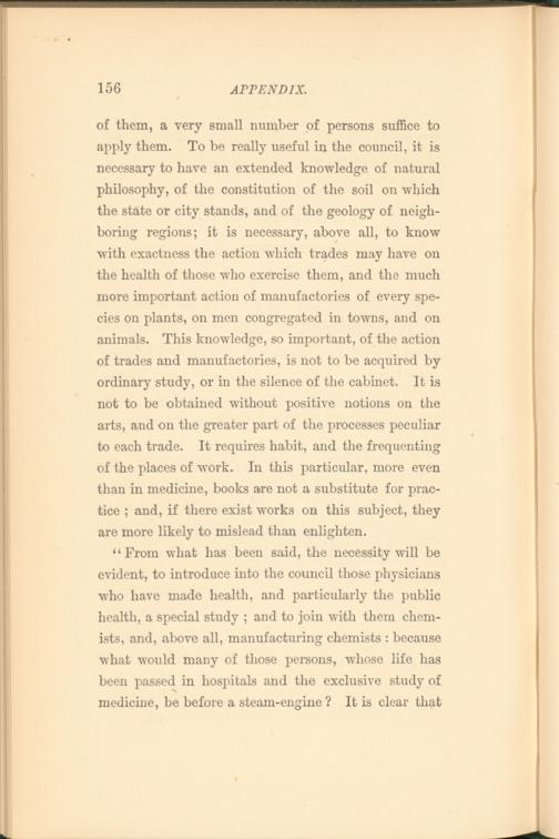 “From what has been said, the necessity will be evident, to introduce into the council those physicians who have made health, and particularly the public health, a special study ; and to join with them chemists, and, above all, manufacturing chemists : because what would many of those persons, whose life has been passed in hospitals and the exclusive study of medicine, be before a steam-engine ? It is clear that