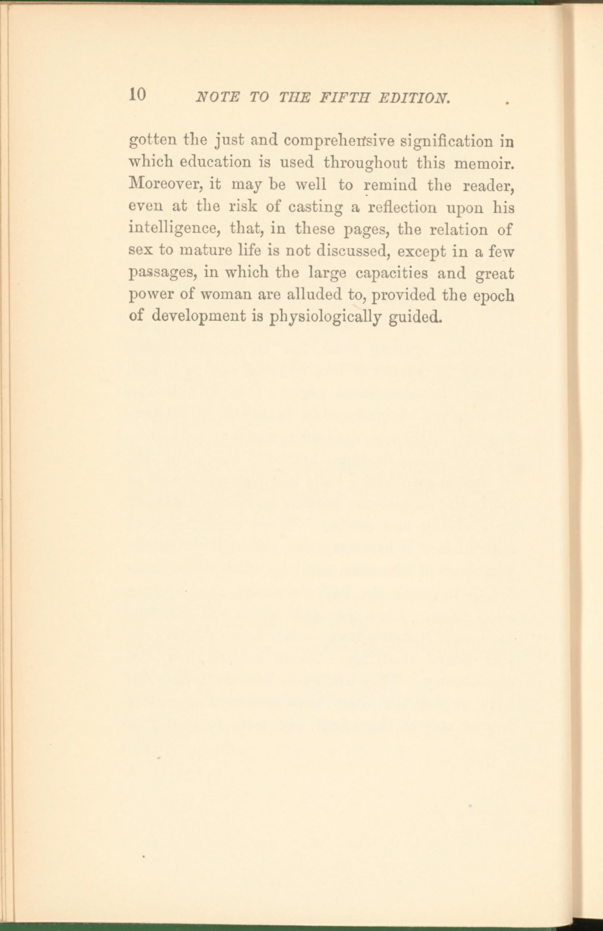 gotten the just and comprehensive signification in which education is used throughout this memoir. Moreover, it may he well to remind the reader, even at the risk of casting a reflection upon his intelligence, that, in these pages, the relation of sex to mature life is not discussed, except in a few passages, in which the large capacities and great power of woman are alluded to, provided the epoch of development is physiologically guided.