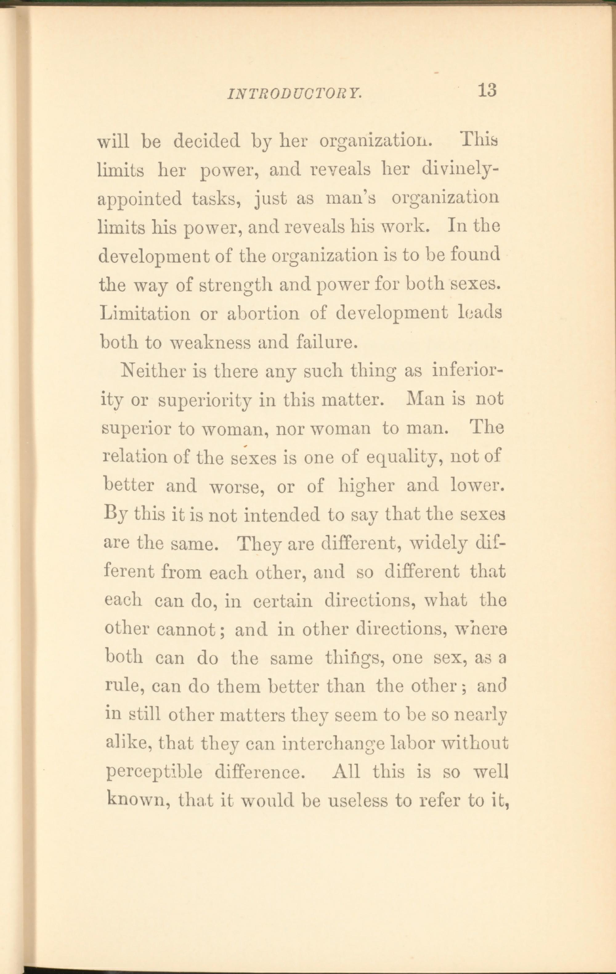 Neither is there any such thing as inferiority or superiority in this matter. Man is not superior to woman, nor woman to man. The relation of the sexes is one of equality, not of better and worse, or of higher and lower. By this it is not intended to say that the sexes are the same. They are different, widely different from each other, and so different that each can do, in certain directions, what the other cannot; and in other directions, where both can do the same things, one sex, as a rule, can do them better than the other; and in still other matters they seem to be so nearly alike, that they can interchange labor without perceptible difference. All this is so well known, that it would be useless to refer to it,