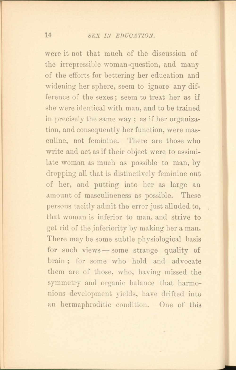 were it not that much of the discussion of the irrepressible woman-question, and many of the efforts for bettering her education and widening her sphere, seem to ignore any difference of the sexes; seem to treat her as if she were identical with man, and to be trained in precisely the same way ; as if her organization, and consequently her function, were masculine, not feminine. There are those who write and act as if their object were to assimilate woman as much as possible to man, by dropping all that is distinctively feminine out of her, and putting into her as large an amount of masculineness as possible. These persons tacitly admit the error just alluded to, that woman is inferior to man, and strive to get rid of the .inferiority by making her a man. There may be some subtle physiological basis for such views—some strange quality of brain ; for some who hold and advocate them are of those, who, having missed the symmetry and organic balance that harmonious development yields, have drifted into an hermaphroditic condition. One of this