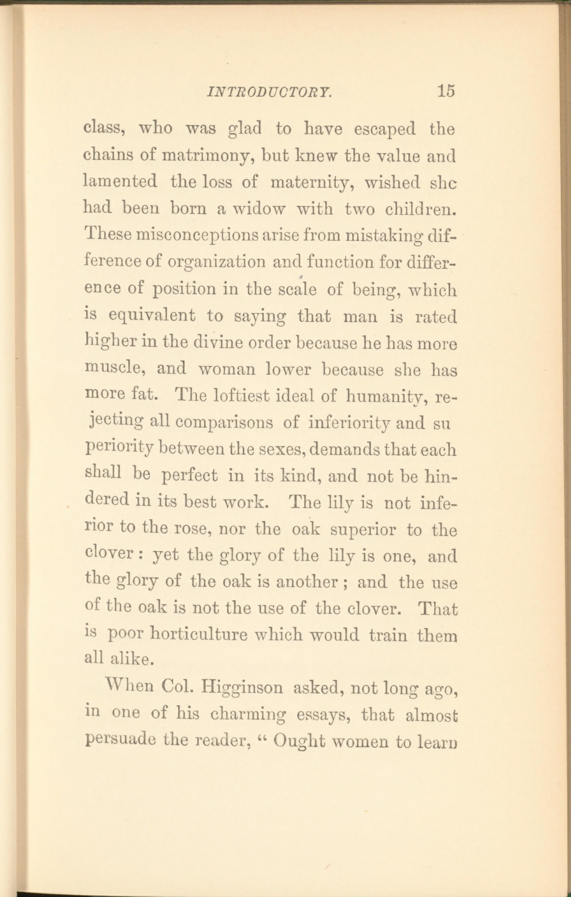 class, who was glad to have escaped the chains of matrimony, but knew the value and lamented the loss of maternity, wished she had been born a widow with two children. These misconceptions arise from mistaking difference of organization and function for difference of position in the scale of being, which is equivalent to saying that man is rated higher in the divine order because he has more muscle, and woman lower because she has more fat. The loftiest ideal of humanity, rejecting all comparisons of inferiority and su periority between the sexes, demands that each shall be perfect in its kind, and not be hindered in its best work. The lily is not inferior to the rose, nor the oak superior to the clover : yet the glory of the lily is one, and the glory of the oak is another; and the use of the oak is not the use of the clover. That is poor horticulture which would train them all alike.