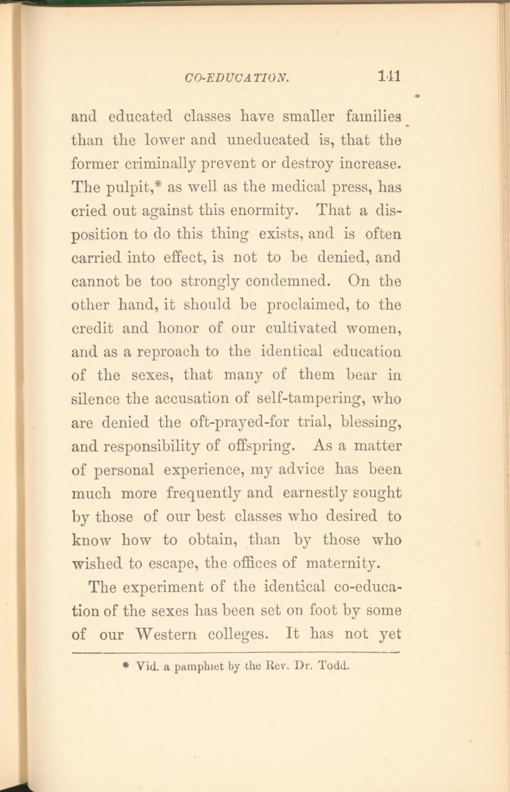 and educated classes have smaller families than the lower and uneducated is, that the former criminally prevent or destroy increase. The pulpit,* as well as the medical press, has cried out against this enormity. That a disposition to do this thing exists, and is often carried into effect, is not to be denied, and cannot he too strongly condemned. On the other hand, it should be proclaimed, to the credit and honor of our cultivated women, and as a reproach to the identical education of the sexes, that many of them hear in silence the accusation of self-tampering, who are denied the oft-prayed-for trial, blessing, and responsibility of offspring. As a matter of personal experience, my advice has been much more frequently and earnestly sought by those of our best classes who desired to know how to obtain, than by those who wished to escape, the offices of maternity.
