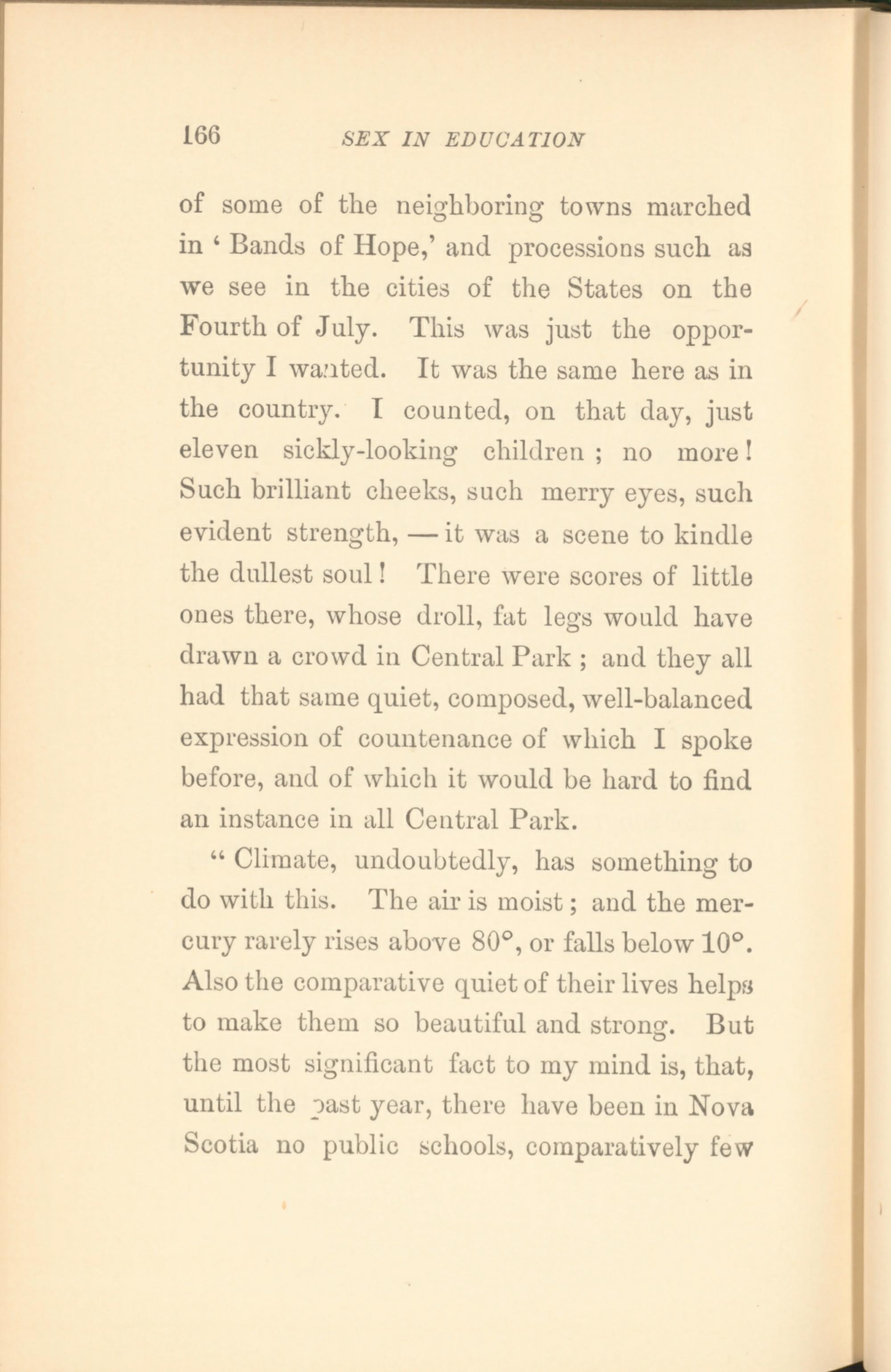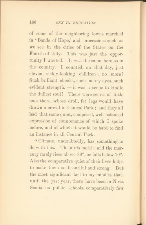 “ Climate, undoubtedly, has something to do with this. The air is moist; and the mercury rarely rises above 80°, or falls below 10°. Also the comparative quiet of their lives helps to make them so beautiful and strong. But the most significant fact to my mind is, that, until the past year, there have been in Nova Scotia no public schools, comparatively few