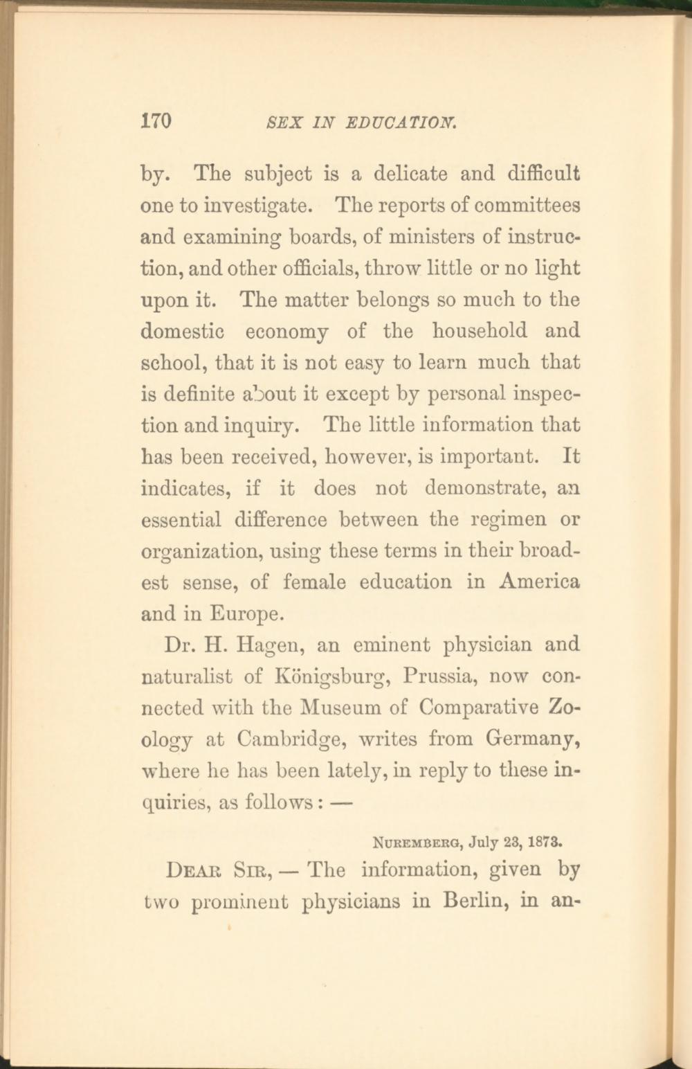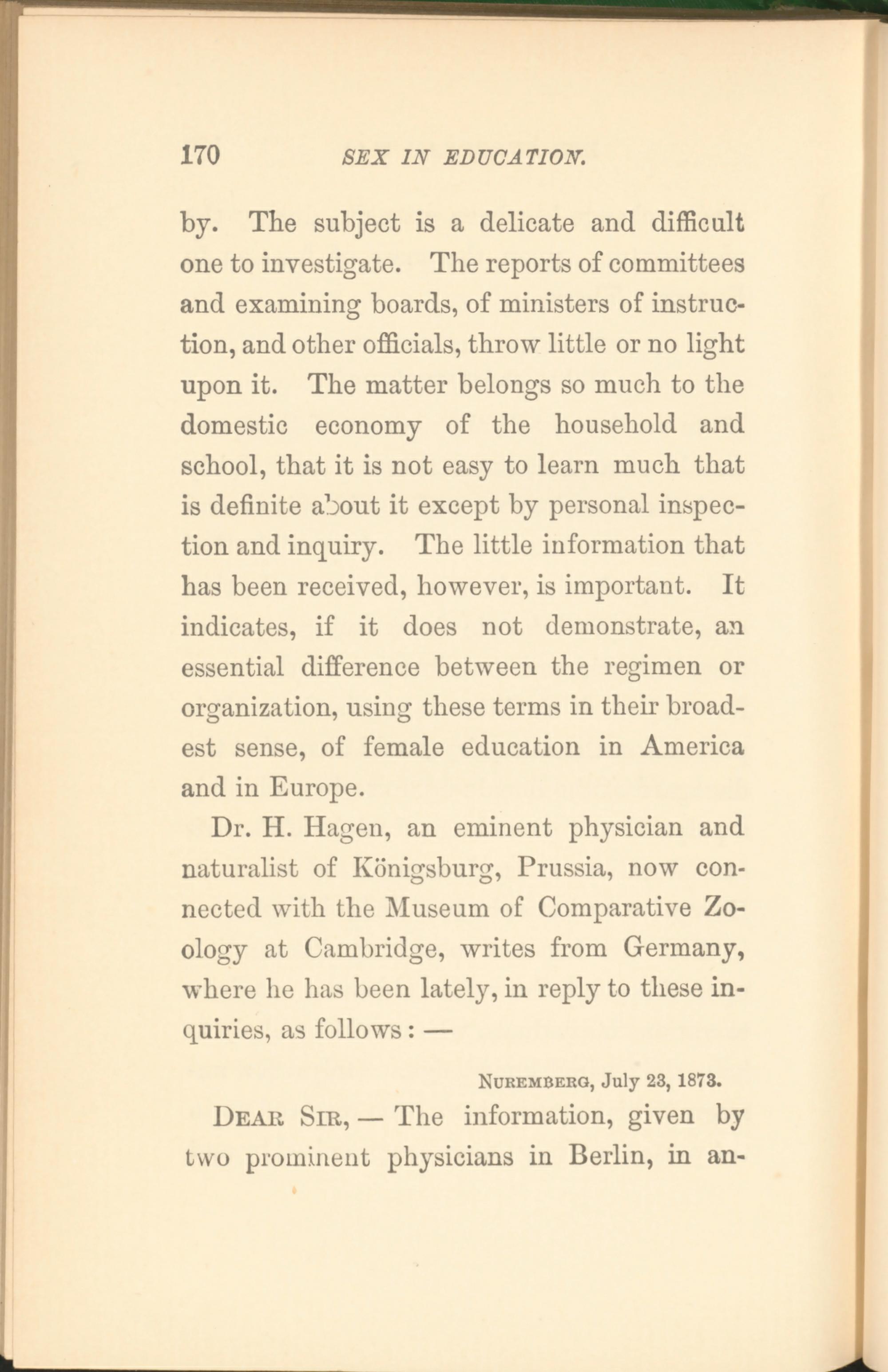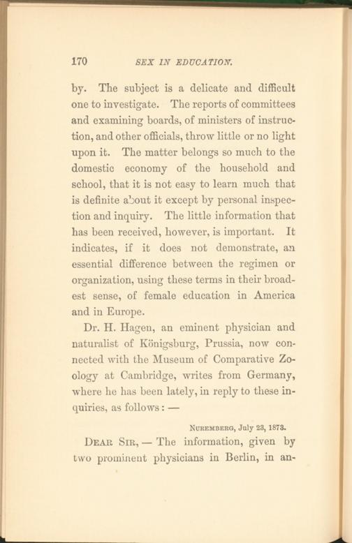 by. The subject is a delicate and difficult one to investigate. The reports of committees and examining boards, of ministers of instruction, and other officials, throw little or no light upon it. The matter belongs so much to the domestic economy of the household and school, that it is not easy to learn much that is definite about it except by personal inspection and inquiry. The little information that has been received, however, is important. It indicates, if it does not demonstrate, an essential difference between the regimen or organization, using these terms in their broadest sense, of female education in America and in Europe.