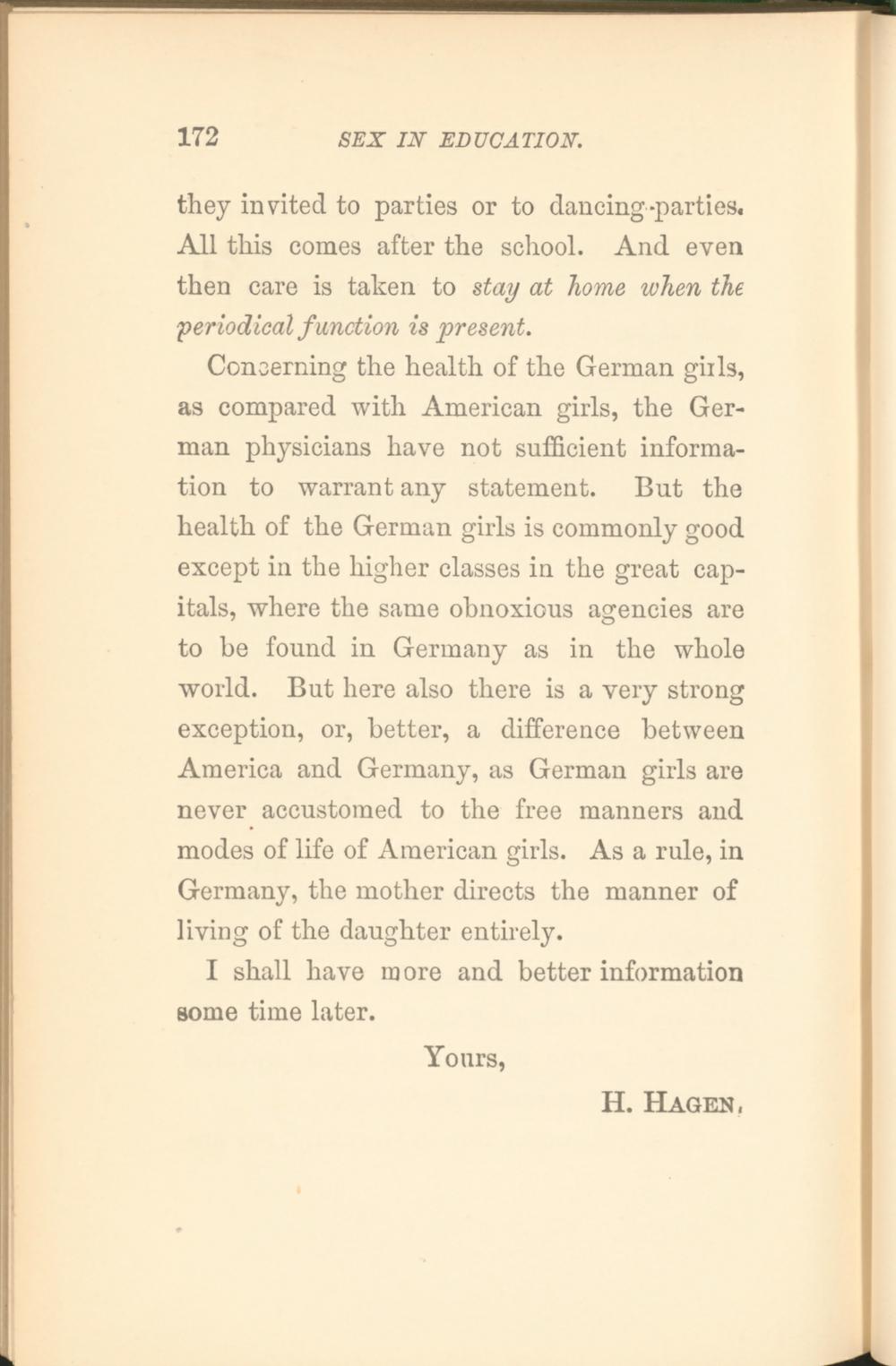 Concerning the health of the German gills, as compared with American girls, the German physicians have not sufficient information to warrant any statement. But the health of the German girls is commonly good except in the higher classes in the great capitals, where the same obnoxious agencies are to be found in Germany as in the whole world. But here also there is a very strong exception, or, better, a difference between America and Germany, as German girls are never accustomed to the free manners and modes of life of American girls. As a rule, in Germany, the mother directs the manner of living of the daughter entirely.