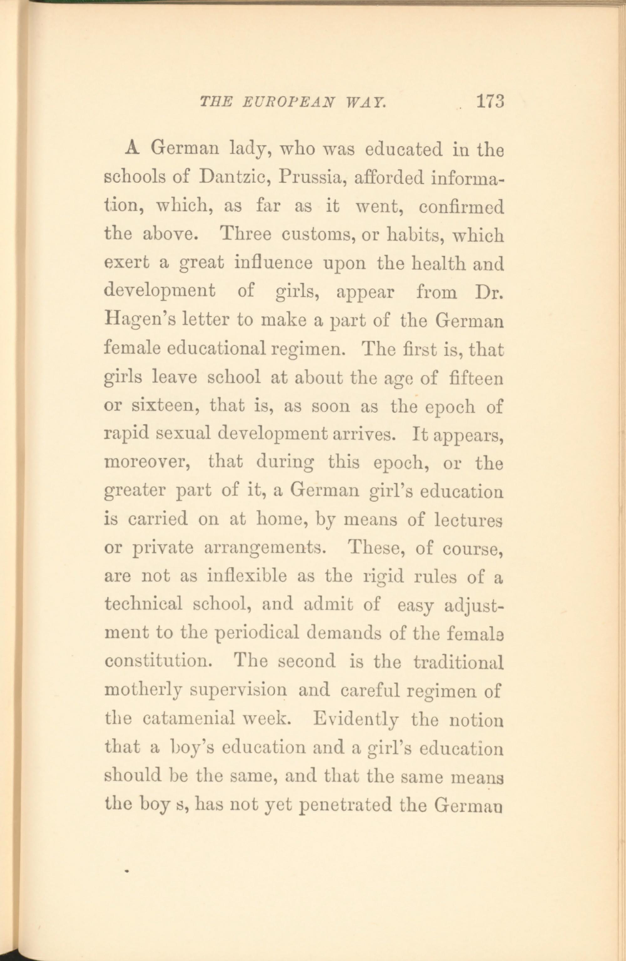 A German lady, who was educated in the schools of Dantzic, Prussia, afforded information, which, as far as it went, confirmed the above. Three customs, or habits, which exert a great influence upon the health and development of girls, appear from Dr. Hagen’s letter to make a part of the German female educational regimen. The first is, that girls leave school at about the age of fifteen or sixteen, that is, as soon as the epoch of rapid sexual development arrives. It appears, moreover, that during this epoch, or the greater part of it, a German girl’s education is carried on at home, by means of lectures or private arrangements. These, of course, are not as inflexible as the rigid rules of a technical school, and admit of easy adjustment to the periodical demands of the female constitution. The second is the traditional motherly supervision and careful regimen of the catamenial week. Evidently the notion that a boy’s education and a girl’s education should be the same, and that the same means the boy s, has not yet penetrated the German