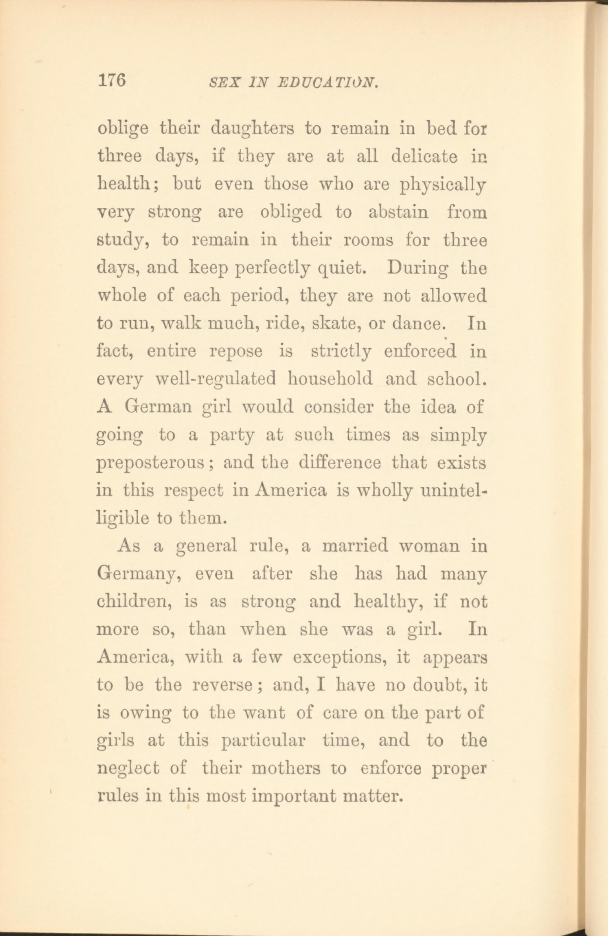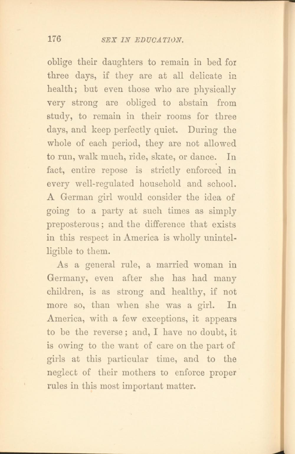 oblige their daughters to remain in bed for three days, if they are at all delicate in health; but even those who are physically very strong are obliged to abstain from study, to remain in their rooms for three days, and keep perfectly quiet. During the whole of each period, they are not allowed to run, walk much, ride, skate, or dance. In fact, entire repose is strictly enforced in every well-regulated household and school. A German girl would consider the idea of going to a party at such times as simply preposterous; and the difference that exists in this respect in America is wholly unintelligible to them.