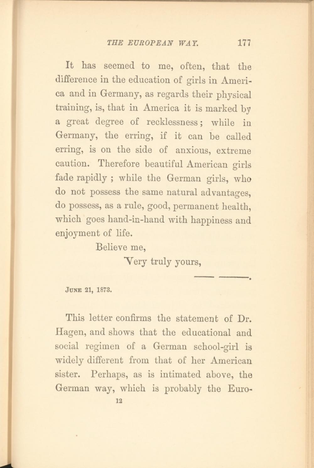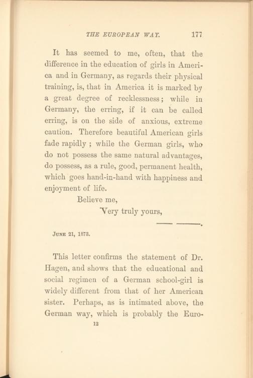 This letter confirms the statement of Dr. Hagen, and shows that the educational and social regimen of a German school-girl is widely different from that of her American sister. Perhaps, as is intimated above, the German way, which is probably the Euro- 12