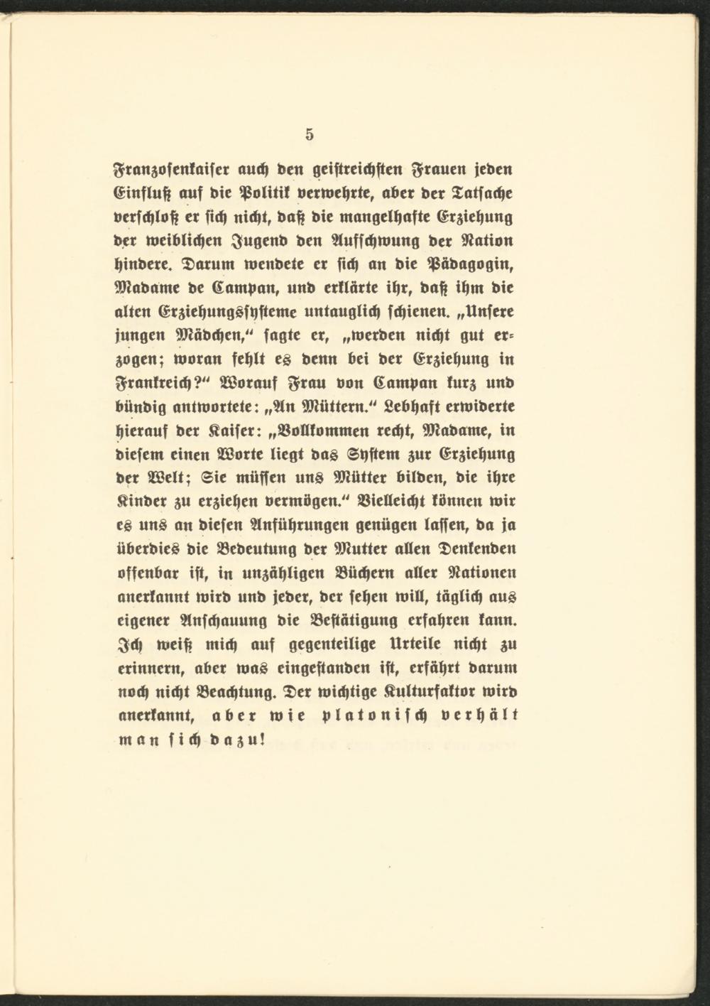 ftronsofcnfaifcr auch ben geiftreichften grauen icbctt (Sinfluff auf bie 'fSolitif bermehtte, aber bet Satfadje berfchloft et fidf nidit, bah bie mangelhafte (Erziehung bet meiblichen $ugenb ben $luffchmung bet Nation hinbete. 'Saturn menbete et fich an bie ^Sabagogin r 9Jtabame be (£ampan, unb erflärte ihr, bah tynt bie alten (StziehungSfhfteme untauglich fchicnen. „Unfete jungen SJJtäbchen,“ fagte er f „merben nicht gut et* zogen; moran fehlt es benn bei bet Ziehung in ftranlreich?" SSßorauf $rau bon (Sampan lurz unb biinbig antmottete: „9ln 9SMttem." Sebhaft ermiberte hietauf bet Äaifer: „VoWommen recht, 9Jlabame, in biefem einen äöorte liegt bas Stiftern zur (Erziehung bet SSelt; Sie muffen uns 9Jtütter bilben, bie ihte SHnber ju erziehen betmögen." Vielleicht lönnen mit es uns an biefen Einführungen genügen laffen, ba ja übetbieS bie Vebeutung bet EJluttet allen Sentenben offenbar ift, in unzähligen Vüchero aüet Nationen anetlannt mirb unb jebet, bet fehen mill, täglich aus eigener Elnfchauung bie Veftäügung erfahren lann. 3«h meih mich auf gegenteilige Urteile nicht zu erinnern, abet maS eingeftanben ift, erfährt batum noch nicht Veachtung. Set «nichtige &ulturfattor mitb anetlannt, aber mie platonifd} bethält man fich b a z u!