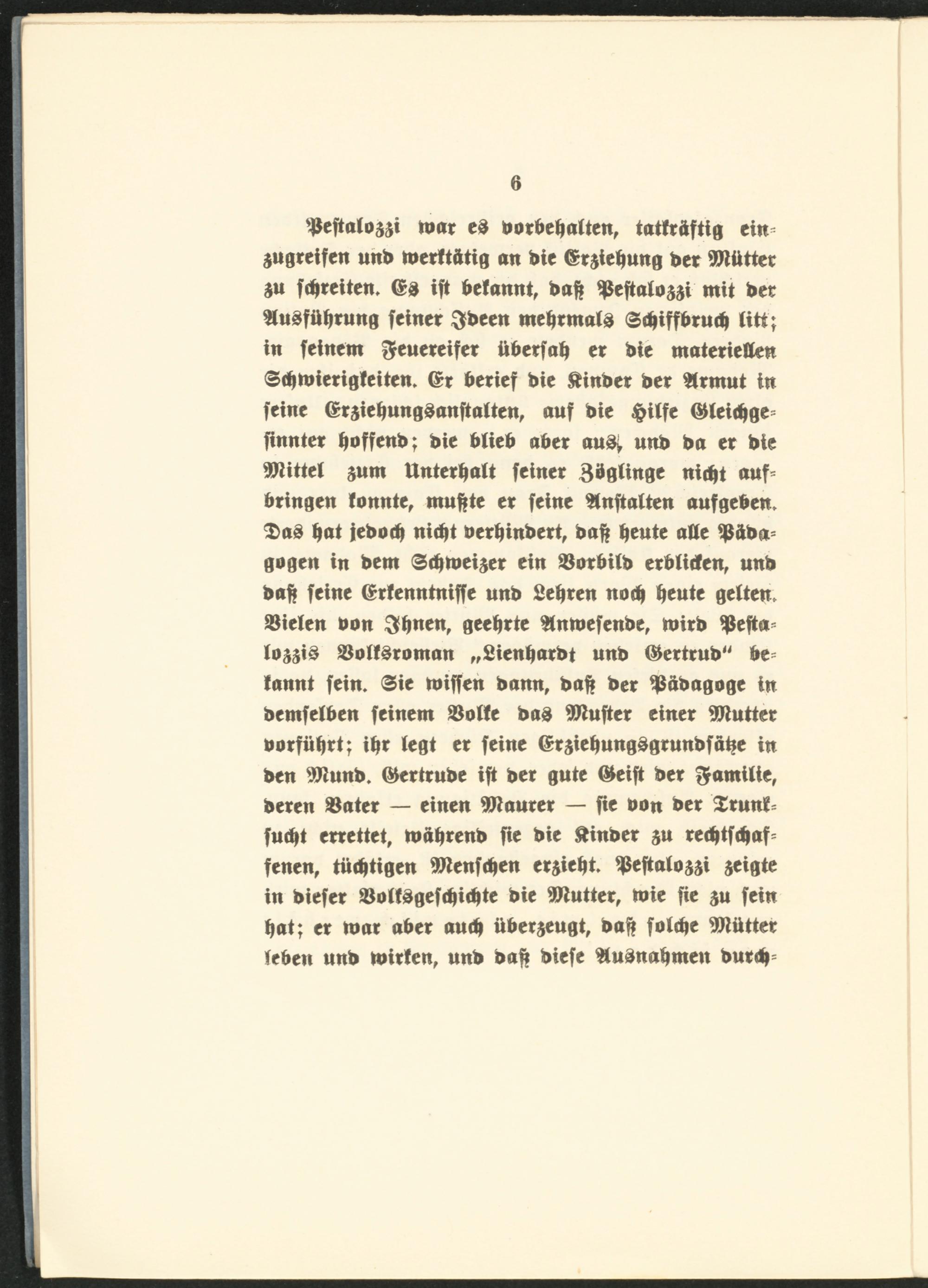 *$eftato$$i mar e3 borbehalten, tatfräftig tin- $ugreifen unb merftätig an tue ©rjiehung ber SWütter $u f(breiten, @8 ift begannt, baft ^eftalo^i mit ber 3lu3führung feiner Fbeen mehrmals Scftiffbruch Utt; in feinem Feuereifer tiberfah er bie materiellen Scftmierigteiten. (£r berief bie Äinbcr ber ttrmut in feine ($r$iehung3anftalten, auf bie #ilfc (JHeichge= finnter ftoffenb; bie blieb aber au£> unb ba er bie Mittel sum Unterhalt feiner Bbglinge nicht auf= bringen tonnte, mnftte er feine 9tnftalten aufgeben. $a8 hat feboch nicht berhinbert, baft heute alle $&ba= gogen in bem Schmei$er ein SBorbilb erblicfen, nnb baft feine (Srfenntniffe unb Sehren noch heute gelten, fielen oon Fhuen, geehrte Slnmefenbe, mirb $efta* lo^ia aSol!8roman „Sienharbt unb ©ertrub" be= fannt fein. Sie miffen bann, baft ber ^ßabagoge in bemfelben feinem SJolfe bab Wufter einer Butter oorführt; ihr legt er feine <$r$iehung3grunbfäfte in ben Wunb. <$ertrube ift ber gute <&eift ber Familie, bereu SJater — einen flttanrer — fie bon ber Srunt* fucht errettet, mahrenb fie bie Äinber ju recfttfchaf= fenen, tüchtigen Wenfchen ersieht, ^ßeftalojji jeigte in biefer SSolfagefcftichte bie Wutter, tbie fie su fein hat; er mar aber auch überzeugt, baft folche Mütter leben nnb mirfen, unb baft biefe ftuänahmen bur<h=