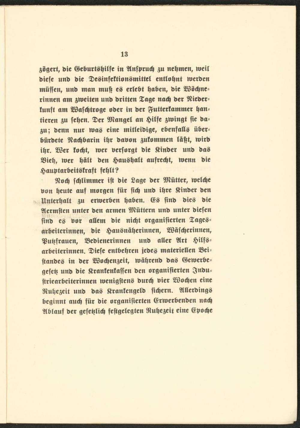 9tocp fchUmmer ift bie Sage ber Mütter, melcpe bon heute auf morgen für fiep unb ihre $inber ben * Unterhalt $a ermerben hüben. ©£ fmb bieS bie 2(ermften unter ben armen füttern unb unter biefen finb es bor allem bie nicht organifierten SageS* arbeiterinnen, bie 4?au£naberinnen, SBäfcperinnen, 2$upfrauen, SBebieuerinnen unb aller 2lrt £ilf3= arbeiterinnen. Siefe entbehren jebes materiellen 23ei* ftanbes in ber SBocpenseit, mährenb bas ©enterbe* gef eh unb bie ßranfenlaffen ben organifierten Snbu= ftriearbeiterinnen menigftenö burep hier 2Bocpen eine fRupeseit unb ba§ ^rantengelb fiepern. SlllerbingS beginnt auch für bie organifierten ©rmerbenben nach Slbfauf ber gefeplicp feftgelegten fRupejeit eine ©poepe