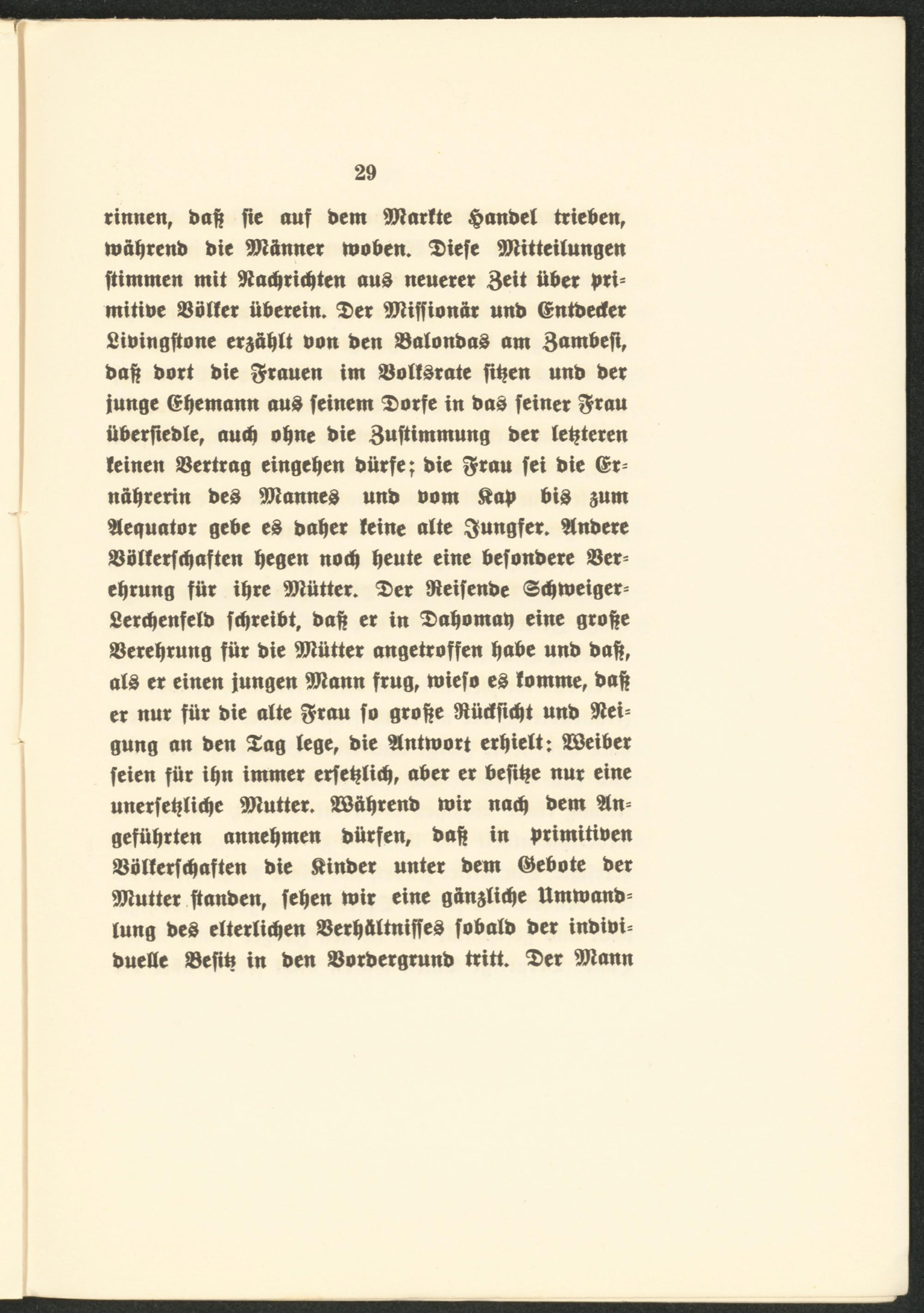 rinnen, baft {te auf bent Partie §anbet trieben, mäfjrenb bie Männer moben. $iefe Mitteilungen ftimmen mit Nachrichten and neuerer Beit über pxx mitibe Götter überein. $er Miffionär unb ©ntbeder Sioingftone erzählt bon ben SBalonbad am 3<*mbefi, baft bort bie grauen im Söoltdrate fiften unb ber junge ©bemann aud feinem $orfe in bad feiner $rau überlebte, auch oft ne bie Buftimmung ber letzteren leinen Vertrag eingeben bürfe; bie f$rau fei bie ©r= nährerin beb Manned unb bom £ab bid aunt 9t equator gebe ed bafter leine alte Jungfer, inhere 33ötlerfchaften hegen noch beute eine befonbere 33er= eftrung für ihre Mütter. $er Neifenbe ©chmeiger* Sercftenfelb fcftreibt, baft er in $ahontab eine grofte Verehrung für bie Mütter angetroffen habe unb baft, aid er einen jungen Mann frug, miefo ed lomme, baft er nur für bie alte ftrau fo grofte Nücfficbt unb Nei= gung an ben £ag lege, bie Antwort erhielt: SEßeiber feien für ihn immer erfeftlicft, aber er beftfte nur eine unerfeftlicfte Mutter, äöaftrenb mir nach bem 9ln= geführten anneftmen bürfen, baft in brimitiben 93bllerfchaften bie $inber unter bem ©ebote ber Mutter ftanben, feften mir eine gftnalithe Ummanb= lung bed elterlichen SBerhältnijfed fobalb ber inhibit bueflc »efifc in ben SSorbergrunb tritt. $>er Mann