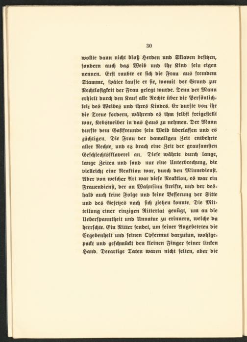 moHte bann nitty* bloty gerben unb Sflaoen befityen, fonbern autty bag BBeib nnb ityr Äiub fein eigen nennen. ©rft raubte er Jitty bie $rau aug fretnbem (Stamme, fbäter taufte er fie, womit ber ©runb $ur fflettytlofigfeit ber $rau gelegt mürbe. Senn ber Wann ertyiett burtty ben Äauf alte JKectyte über bie 9$erföntitty s feit beg BSeibeg nnb ityreg &inbeg. ©r bnrfte bou ityr bie Xreue forbem, wätyrenb eg itym felbft freigefteüt mar, &ebgmeiber in bag gaug ä« netymen. Ser Wann bnrfte bem ©aftfreunbe fein Söeib überlaffen unb eg äüttytigen. Sie ^rau ber bamaligen 3*it entbetyrte aller töettyte, unb eg bracty eine 3*it ber graufamften ©efttylettytgfflaberei an. Siefe wätyrte burtty lange, lange Briten unb fanb nur eine Unterbrettyung, bie bietteittyt eine ffteattian war, burtty ben Winnebienft. Aber non melttyer Art mar biefe 'Jieaftion, eg mar ein Bfrauenbienft, ber an üöatynfinn ftreifte, unb ber beg= tyalb autty feine ftolge unb feine S3efferung ber (Sitte unb beg ©cfetyeg natty futy gietyen tonnte. Sie Wit= teilung einer einzigen Drittertat genügt, um an bie Ueberfbannttyeit unb Unnatur erinnern, melttye fca tyerrfttyte. ©in Witter fenbet, um feiner Angebeteten bie ©rgebentyeit unb feinen Opfermut barjutun, motylge? patft unb gefttymücft ben fleinen Ringer feiner Unten ganb. derartige Säten waren nittyt feiten, aber bie