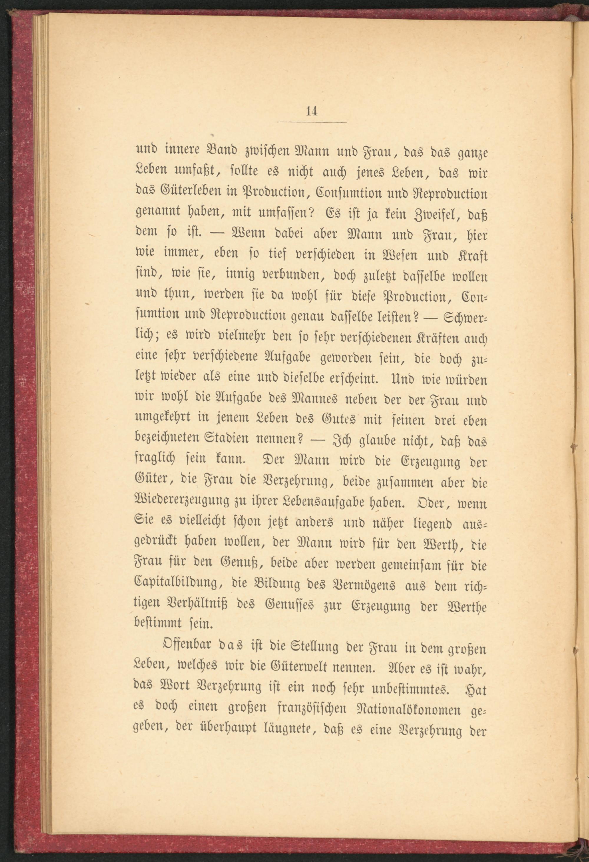 und innere Band zwischen Mann und Frau, das das ganze Leben umfaßt, sollte es nicht auch jenes Leben, das wir das Güterleben in Production, Consumtion und Reproduktion genannt haben, mit umfassen? Es ist ja kein Zweifel, daß dem so ist. — Wenn dabei aber Mann und Frau, hier wie immer, eben so tief verschieden in Wesen und Kraft sind, wie sie, innig verbunden, doch zuletzt dasselbe wollen und thun, werden sie da wohl für diese Production, Consumtion und Reproduktion genau dasselbe leisten? — Schwerlich ; es wird vielmehr den so sehr verschiedenen Kräften auch eine sehr verschiedene Aufgabe geworden sein, die doch zuletzt wieder als eine und dieselbe erscheint. Und wie würden wir wohl die Aufgabe des Mannes neben der der Frau und umgekehrt in jenem Leben des Gutes mit seinen drei eben bezeichneten Stadien nennen? — Ich glaube nicht, daß das fraglich sein kann. Der Mann wird die Erzeugung der Güter, die Frau die Verzehrung, beide zusammen aber die Wiedererzeugung zu ihrer Lebensaufgabe haben. Oder, wenn Sie es vielleicht schon jetzt anders und näher liegend ausgedrückt haben wollen, der Mann wird für den Werth, die Frau für den Genuß, beide aber werden gemeinsam für die Capitalbildung, die Bildung des Vermögens aus dem richtigen Verhältniß des Genusses zur Erzeugung der Werthe bestimmt sein.