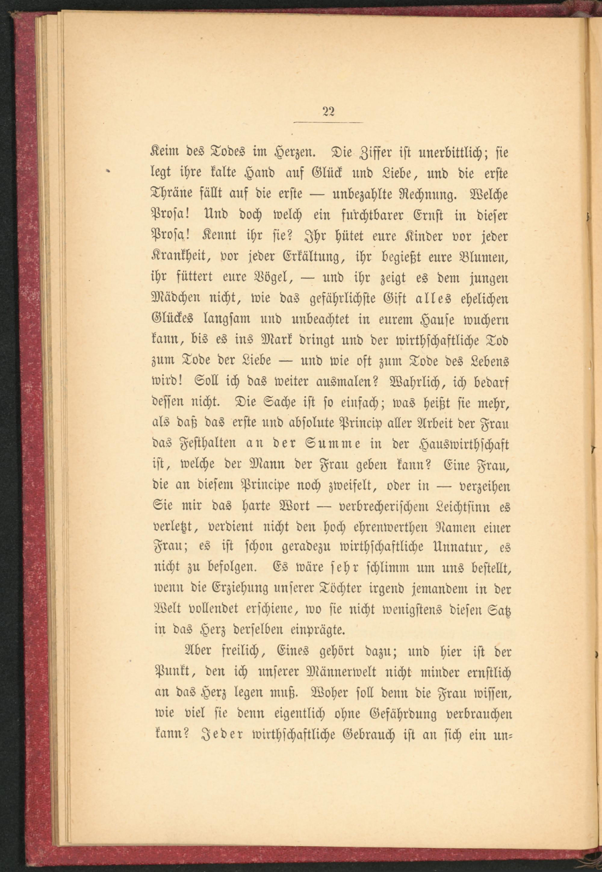 Keim des Todes im Herzen. Die Ziffer ist unerbittlich; sie legt ihre kalte Hand auf Glück und Liebe, und die erste Thräne fällt auf die erste — unbezahlte Rechnung. Welche Prosa! Und doch welch ein furchtbarer Ernst in dieser Prosa! Kennt ihr sie? Ihr hütet eure Kinder vor jeder Krankheit, vor jeder Erkältung, ihr begießt eure Blumen, ihr füttert eure Vogel, — und ihr zeigt es dem jungen Mädchen nicht, wie das gefährlichste Gift alles ehelichen Glückes langsam und unbeachtet in eurem Hause wuchern kann, bis es ins Mark dringt und der wirthschaftliche Tod zum Tode der Liebe — und wie oft zum Tode des Lebens wird! Soll ich das weiter ausmalen? Wahrlich, ich bedarf dessen nicht. Die Sache ist so einfach; was heißt sie mehr, als daß das erste und absolute Princip aller Arbeit der Frau das Festhalten an der Summe in der Hauswirthschaft ist, welche der Mann der Frau geben kann? Eine Frau, die an diesem Principe noch zweifelt, oder in — verzeihen Sie mir das harte Wort — verbrecherischem Leichtsinn es verletzt, verdient nicht den hoch ehrenwerthen Namen einer Frau; es ist schon geradezu wirthschaftliche Unnatur, es nicht zu befolgen. Es wäre sehr schlimm um uns bestellt, wenn die Erziehung unserer Töchter irgend jemandem in der Welt vollendet erschiene, wo sie nicht wenigstens diesen Satz in das Herz derselben einprägte.
