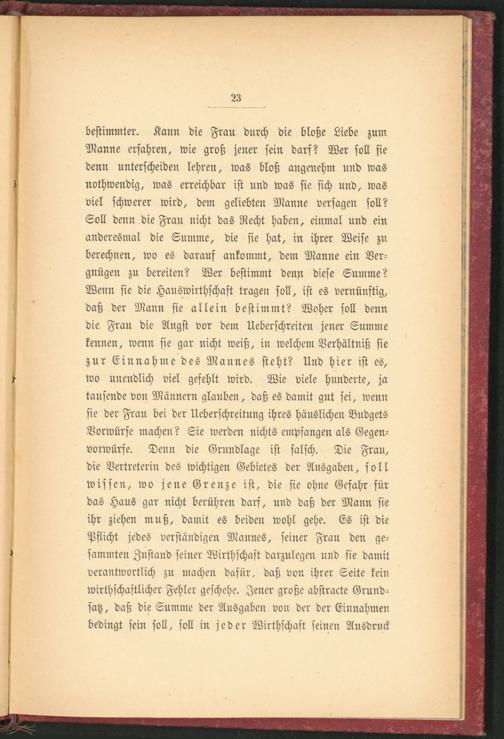 bestimmter. Kann die Frau durch die bloße Liebe zum Manne erfahren, wie groß jener sein darf? Wer soll sie denn unterscheiden lehren, was bloß angenehm und was nothwendig, was erreichbar ist und was sie sich und, was viel schwerer wird, dem geliebten Manne versagen soll? Soll denn die Frau nicht das Recht haben, einmal und ein anderesmal die Summe, die sie hat, in ihrer Weise zu berechnen, wo es darauf ankommt, dem Manne ein Vergnügen zu bereiten? Wer bestimmt denrr diese Summe? Wenn sie die Hauswirthschaft tragen soll, ist es vernünftig, daß der Mann sie allein bestimmt? Woher soll denn die Frau die Angst vor dem Ueberschreiten jener Summe kennen, wenn sie gar nicht weiß, in welchem Verhältniß sie zur Einnahme des Mannes steht? Und hier ist es, wo unendlich viel gefehlt wird. Wie viele Hunderte, ja taufende von Männern glauben, daß es damit gut sei, wenn sie der Frau bei der Ueberschreitnng ihres häuslichen Budgets Vorwürfe macheu? Sie werden nichts empfangen als Gegen- vorwürfe. Denn die Grundlage ist falsch. Die Frau, die Vertreterin des wichtigen Gebietes der Ausgaben, soll wissen, wo jene Grenze ist, die sie ohne Gefahr für das Haus gar nicht berühren darf, und daß der Mann sie ihr ziehen muß, damit es beiden wohl gehe. Es ist die Pflicht jedes verständigen Mannes, seiner Frau den gesummten Zustand seiner Wirthschaft darzulegen und sie damit verantwortlich zu machen dafür, daß von ihrer Seite kein wirthschaftlicher Fehler geschehe. Jener große abstracto Grundsatz, daß die Summe der Ausgaben von der der Einnahmen bedingt sein soll, soll in jeder Wirthschaft seinen Ausdruck