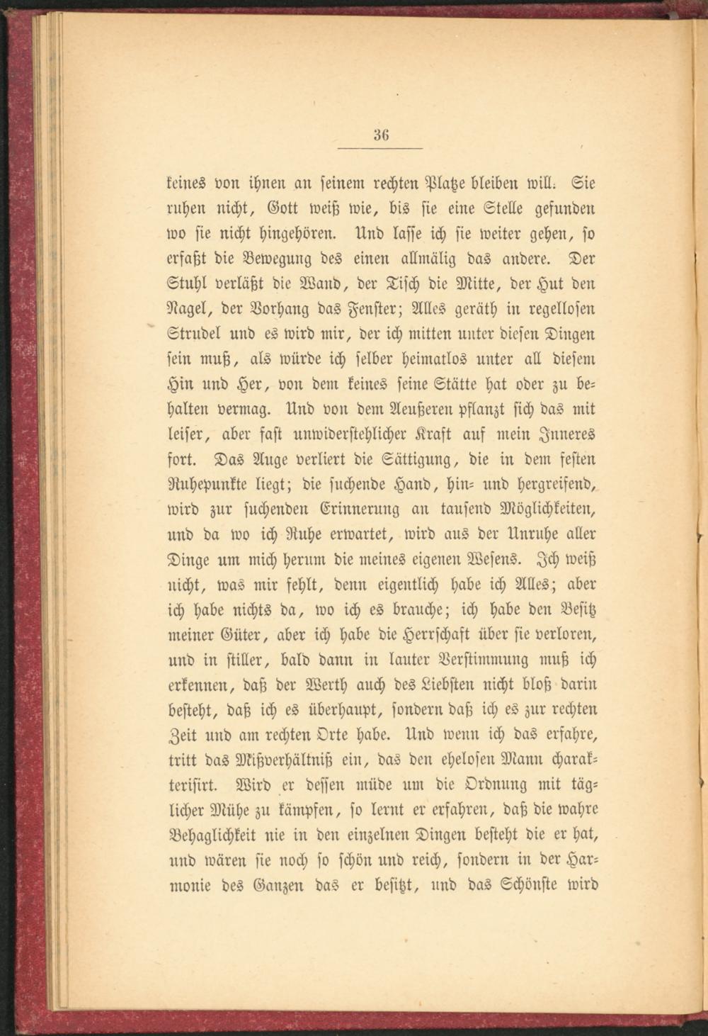 keines von ihnen an seinem rechten Platze bleiben will- Sie ruhen nicht, Gott weiß wie, bis sie eine Stelle gefunden wo sie nicht hingehören. Und lasse ich sie weiter gehen, so erfaßt die Bewegung des einen allmälig das andere. Der Stuhl verläßt die Wand, der Tisch die Mitte, der Hut den Nagel, der Vorhang das Fenster; Alles geräth in regellosen Strudel und es wird mir, der ich mitten unter diesen Dingen sein muß, als würde ich selber heimatlos unter all diesem Hin und Her, von dem keines seine Stätte hat oder zu behalten vermag. Und von dem Aeußeren pflanzt sich das mit leiser, aber fast unwiderstehlicher Kraft auf mein Inneres fort. Das Auge verliert die Sättigung, die in dem festen Ruhepunkte liegt; die suchende Hand, hin- und hergreifend, wird zur suchenden Erinnerung an tausend Möglichkeiten, und da wo ich Ruhe erwartet, wird aus der Unruhe aller Dinge um mich herum die meines eigenen Wesens. Ich weiß nicht, was mir fehlt, denn eigentlich habe ich Alles; aber ich habe nichts da, wo ich es brauche; ich habe den Besitz meiner Güter, aber ich habe die Herrschaft über sie verloren, und in stiller, bald dann in lauter Verstimmung muß ich erkennen, daß der Werth auch des Liebsten nicht bloß darin besteht, daß ich es überhaupt, sondern daß ich es zur rechten Zeit und am rechten Orte habe. Und wenn ich das erfahre, tritt das Mißverhältniß ein, das den ehelosen Mann charak- terisirt. Wird er dessen müde um die Ordnung mit täglicher Mühe zu kämpfen, so lernt er erfahren, daß die wahre Behaglichkeit nie in den einzelnen Dingen besteht die er hat, und wären sie noch so schön und reich, sondern in der Harmonie des Ganzen das er besitzt, und das Schönste wird