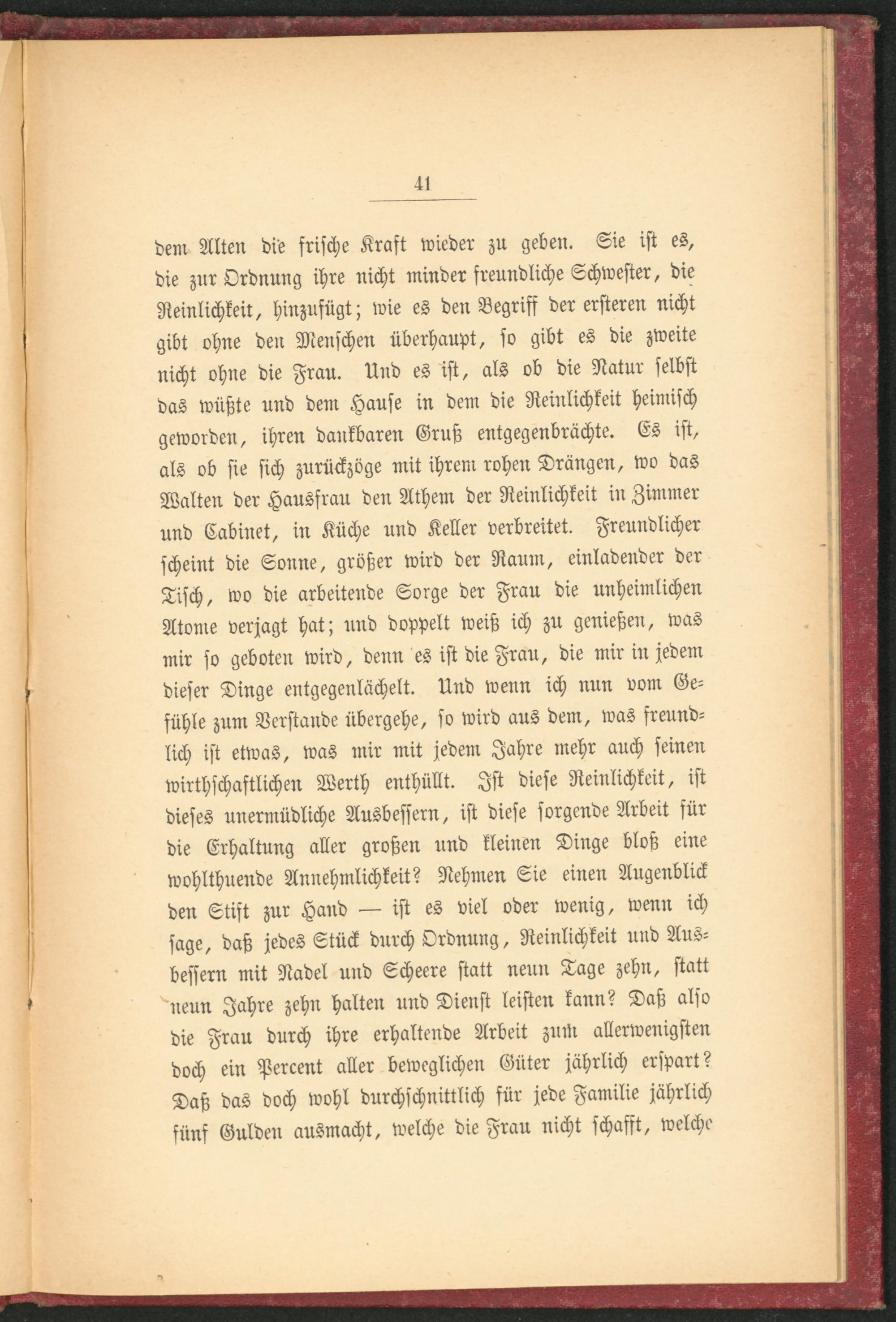 dem Alten die frische Kraft wieder zu geben. Sie ist es, die zur Ordnung ihre nicht minder freundliche Schwester, die Reinlichkeit, hinzufügt; wie es den Begriff der ersteren nicht gibt ohne den Menschen überhaupt, so gibt es die zweite nicht ohne die Frau. Und es ist, als ob die Natur selbst das wüßte und dem Hause in dem die Reinlichkeit heimisch geworden, ihren dankbaren Gruß entgegenbrächte. Es ist, als ob sie sich zurückzöge mit ihrem rohen Drängen, wo das Walten der Hausfrau den Athem der Reinlichkeit in Zimmer und Cabinet, in Küche und Keller verbreitet. Freundlicher scheint die Sonne, größer wird der Raum, einladender der Tisch, wo die arbeitende Sorge der Frau die unheimlichen Atome verjagt hat; und doppelt weiß ich zu genießen, was mir so geboten wird, denn es ist die Frau, die mir in jedem dieser Dinge entgegenlächelt. Und wenn ich nun vom Gefühle zum Verstände übergehe, so wird aus dem, was freundlich ist etwas, was mir mit jedem Jahre mehr auch seinen wirthschaftlichen Werth enthüllt. Ist diese Reinlichkeit, ist dieses unermüdliche Ausbessern, ist diese sorgende Arbeit für die Erhaltung aller großen und kleinen Dinge bloß eine wohlthuende Annehmlichkeit? Nehmen Sie einen Augenblick den Stift zur Hand — ist es viel oder wenig, wenn ich sage, daß jedes Stück durch Ordnung, Reinlichkeit und Ausbessern mit Nadel und Scheere statt neun Tage zehn, statt ^neun Jahre zehn halten und Dienst leisten kann? Daß also die Frau durch ihre erhaltende Arbeit znür allerwenigsten doch ein Percent aller beweglichen Güter jährlich erspart? Daß das doch wohl durchschnittlich für jede Familie jährlich fünf Gulden ausmacht, welche die Frau nicht schafft, welche