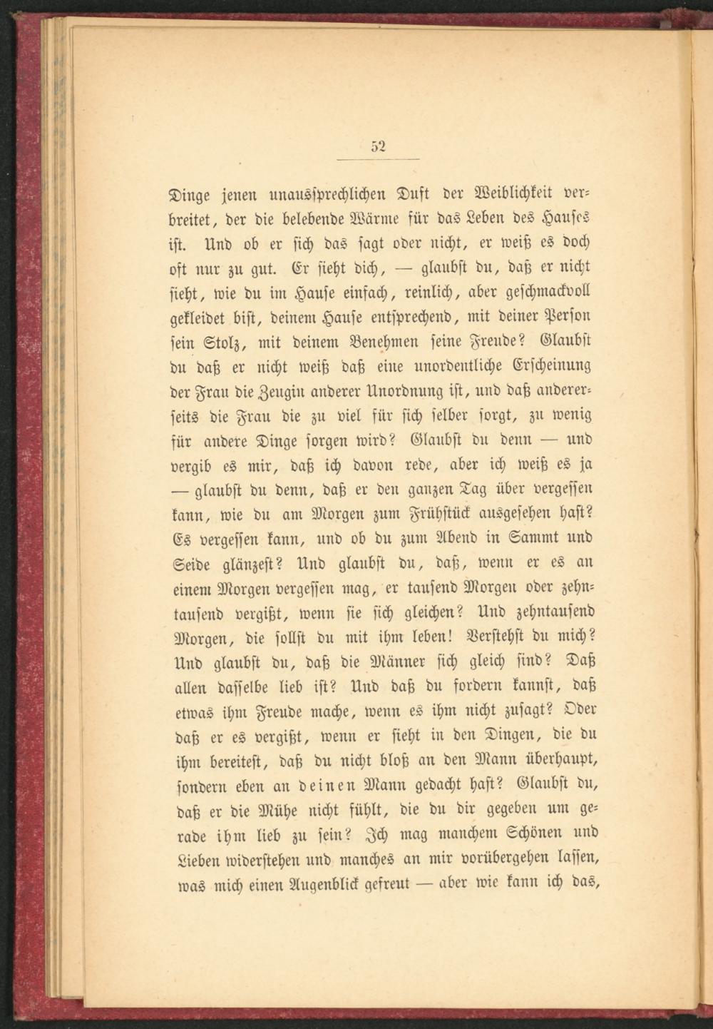 Dinge jenen unaussprechlichen Duft der Weiblichkeit verbreitet, der die belebende Wärme für das Leben des Hauses ist. Und ob er sich das sagt oder nicht, er weiß es doch oft nur zu gut. Er sieht dich, — glaubst du, daß er nicht sieht, wie du im Hause einfach, reinlich, aber geschmackvoll gekleidet bist, deinem Hause entsprechend, mit deiner Person sein Stolz, mit deinem Benehmen seine Freude? Glaubst du daß er nicht weiß daß eine unordentliche Erscheinung der Frau die Zeugin anderer Unordnung ist, und daß andererseits die Frau die zu viel für sich selber sorgt, zu wenig für andere Dinge sorgen wird? Glaubst du denn — und vergib es mir, daß ich davon rede, aber ich weiß es ja — glaubst du denn, daß er den ganzen Tag über vergessen kann, wie du am Morgen zum Frühstück ausgesehen hast? Es vergessen kann, und ob du zum Abend in Sammt und Seide glänzest? Und glaubst du, daß, wenn er es an einem Morgen vergessen mag, er tausend Morgen oder zehntausend vergißt, wenn sie sich gleichen? Und zehntausend Morgen, die sollst du mit ihm leben! Verstehst du mich? Und glaubst du, daß die Männer sich gleich sind? Daß allen dasselbe lieb ist? Und daß du fordern kannst, daß etwas ihm Freude mache, wenn es ihm nicht zusagt? Oder daß er es vergißt, wenn er sieht in den Dingen, die du ihm bereitest, daß du nicht bloß an den Mann überhaupt, sondern eben an deinen Mann gedacht haft? Glaubst du, daß er die Mühe nicht fühlt, die du dir gegeben um gerade ihm lieb zu sein? Ich mag manchem Schönen und Lieben widerstehen und manches an mir vorübergehen lassen, was mich einen Augenblick gefreut — aber wie kann ich das.