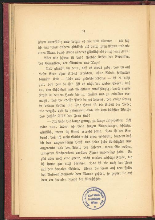 — Ich habe Sie lange genug, zu lange aufgehalten. Ich wäre nun, indem ich diese kurzen Andeutungen schließe, glücklich, wenn ich Eines erreicht hätte. Das ist der Eindruck, daß ich mein Gebiet nicht etwa erschöpft, sondern daß ich den ungemessenen Stoff und seine hohe Wichtigkeit nur angedeutet und den Werth des tieferen, wenn Sie wollen, innigeren Nachdenkens darüber Ihnen nahegelegt habe. Es gibt aber noch eine zweite, nicht minder wichtige Frage, die ich heute gar nicht berühre. Das ist die nach der Frau auf dem socialen Gebiete. Wenn die Frau auf dem Felde der Nationalökonomie dem Manne gehört, so gehört sie auf dem der socialen Frage der Menschheit.
