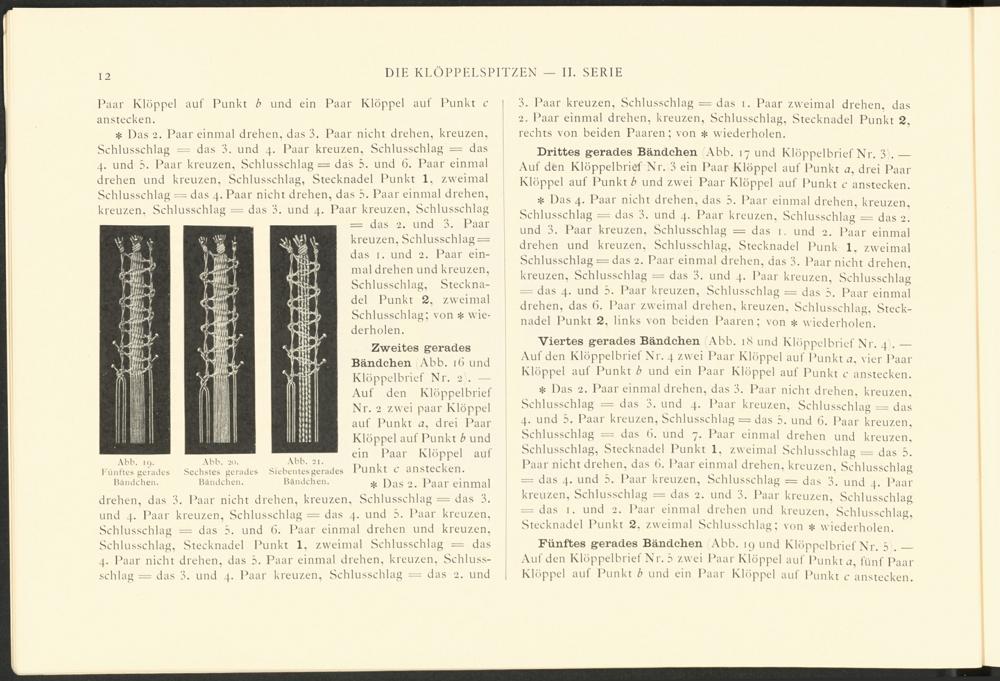 Zweites gerades Bändchen Abb. if> und Klöppelbrief Nr. 2 . — Auf den Klöppelbrief Nr. 2 zwei paar Klöppel auf Punkt a, drei Paar Klöppel auf Punkt b und ein Paar Klöppel auf Punkt c anstecken.
