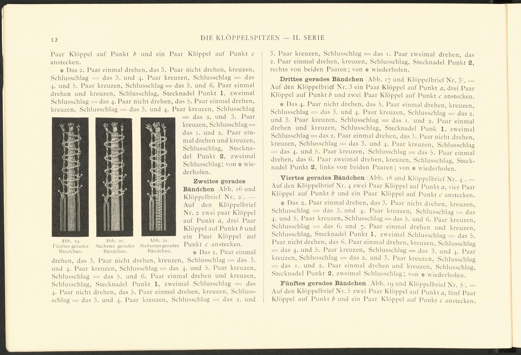 Fünftes gerades Bändchen Abb. 19 und Klöppelbrief Nr. 3 . — Auf den Klöppelbrief Nr. 3 zwei Paar Klöppel auf Punkt <3, fünf Paar Klöppel auf Punkt b und ein Paar Klöppel auf Punkt c anstecken.