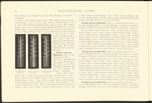 * Das 4 . Paar nicht drehen, das 3. Paar einmal drehen, kreuzen, Schlusschlag = das 3. und 4 . Paar kreuzen, Schlusschlag = das 2 . und 3. Paar kreuzen, Schlusschlag = das 1 . und 2 . Paar einmal drehen und kreuzen, Schlusschlag, Stecknadel Punk 1. zweimal Schlusschlag = das 2 . Paar einmal drehen, das 3. Paar nicht drehen, kreuzen, Schlusschlag = das 3. und 4 . Paar kreuzen, Schlusschlag = das 4 . und 3. Paar kreuzen, Schlusschlag = das 3. Paar einmal drehen, das 6 . Paar zweimal drehen, kreuzen, Schlusschlag, Stecknadel Punkt 2, links von beiden Paaren; von * wiederholen.