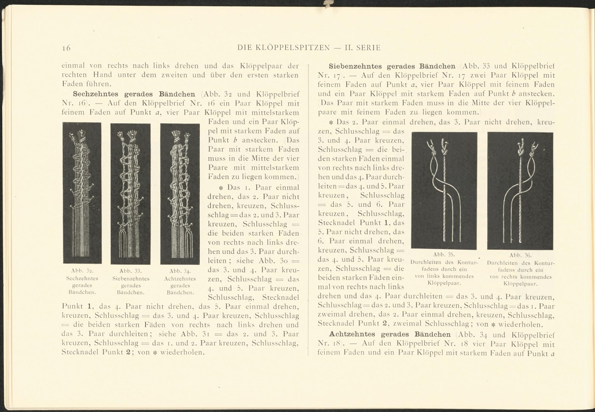 Sechzehntes gerades Bändchen (Abb. 32 und Klöppelbrief Nr. if> . — Auf den Klöppelbrief Nr. i(> ein Paar Klöppel mit feinem Faden auf Punkt a, vier Paar Klöppel mit mittelstarkem
