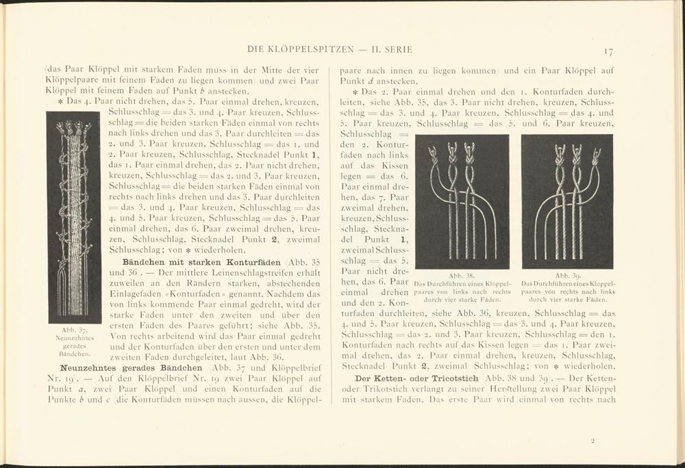 Der Ketten- oder Tricotstich Abb. 38 und 3p . — Der Kettenoder Trikotstich verlangt zu seiner Herstellung zwei Paar Klöppel mit starkem Faden. Das erste Paar wird einmal von rechts nach
