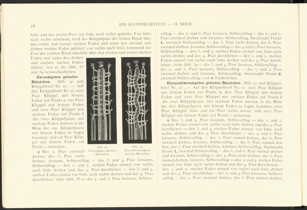 Zwanzigstes gerades Bändchen. Abb. 40 und Klöppelbrief Nr. 20 . — Auf den Klöppelbrief Nr. 20 zwei Paar Klöppel mit feinem Faden auf Punkt u, vier Paar Klöppel mit feinem Faden und zwei Paar Klöppel mit starkem Faden auf Punkt b die zwei Klöppel paare mit starkem Faden müssen in die Mitte der vier Klöppelpaare mit feinem Faden zu liegen kommen und ein Paar Klöppel mit feinem Faden auf Punkt c anstecken.