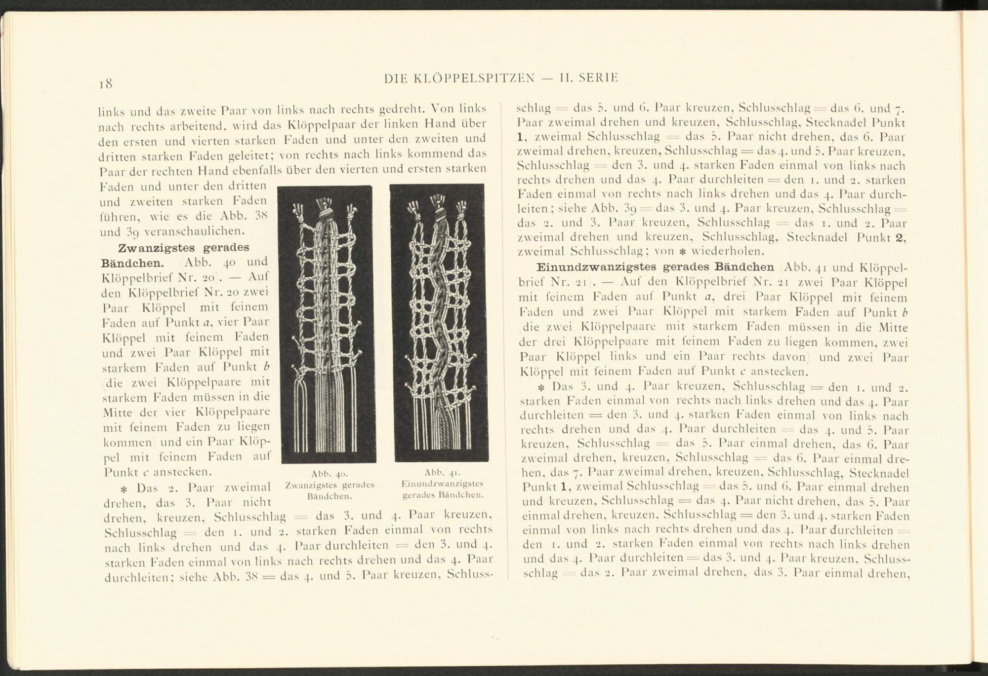 Einundzwanzigstes gerades Bändchen Abb. 41 und Klöppelbrief Nr. 21 . — Auf den Klöppelbrief Nr. 21 zwei Paar Klöppel mit feinem Faden au! Punkt a, drei Paar Klöppel mit feinem Faden und zwei Paar Klöppel mit starkem Faden auf Punkt b die zwei Klöppelpaare mit starkem Faden müssen in die Mitte der drei Klöppelpaare mit feinem Faden zu liegen kommen, zwei Paar Klöppel links und ein Paar rechts davon und zwei Paar Klöppel mit feinem Faden aut Punkt c anstecken.