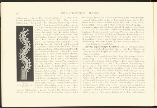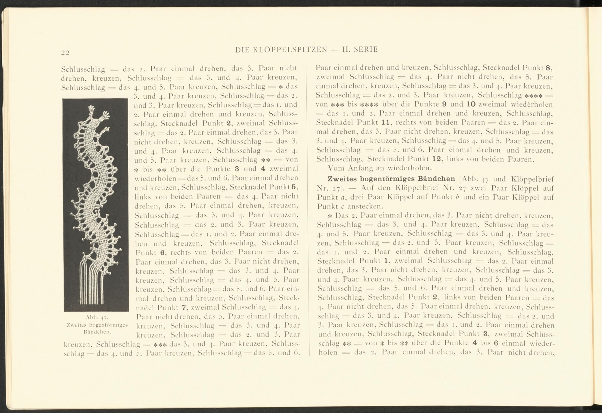 Zweites bogemörmiges Bändchen Abb. 47 und Klöppelbrief Nr. 27 . — Auf den Klöppelbrief Nr. 27 zwei Paar Klöppel auf i Punkt a, drei Paar Klöppel auf Punkt b und ein Paar Klöppel auf Punkt c anstecken.