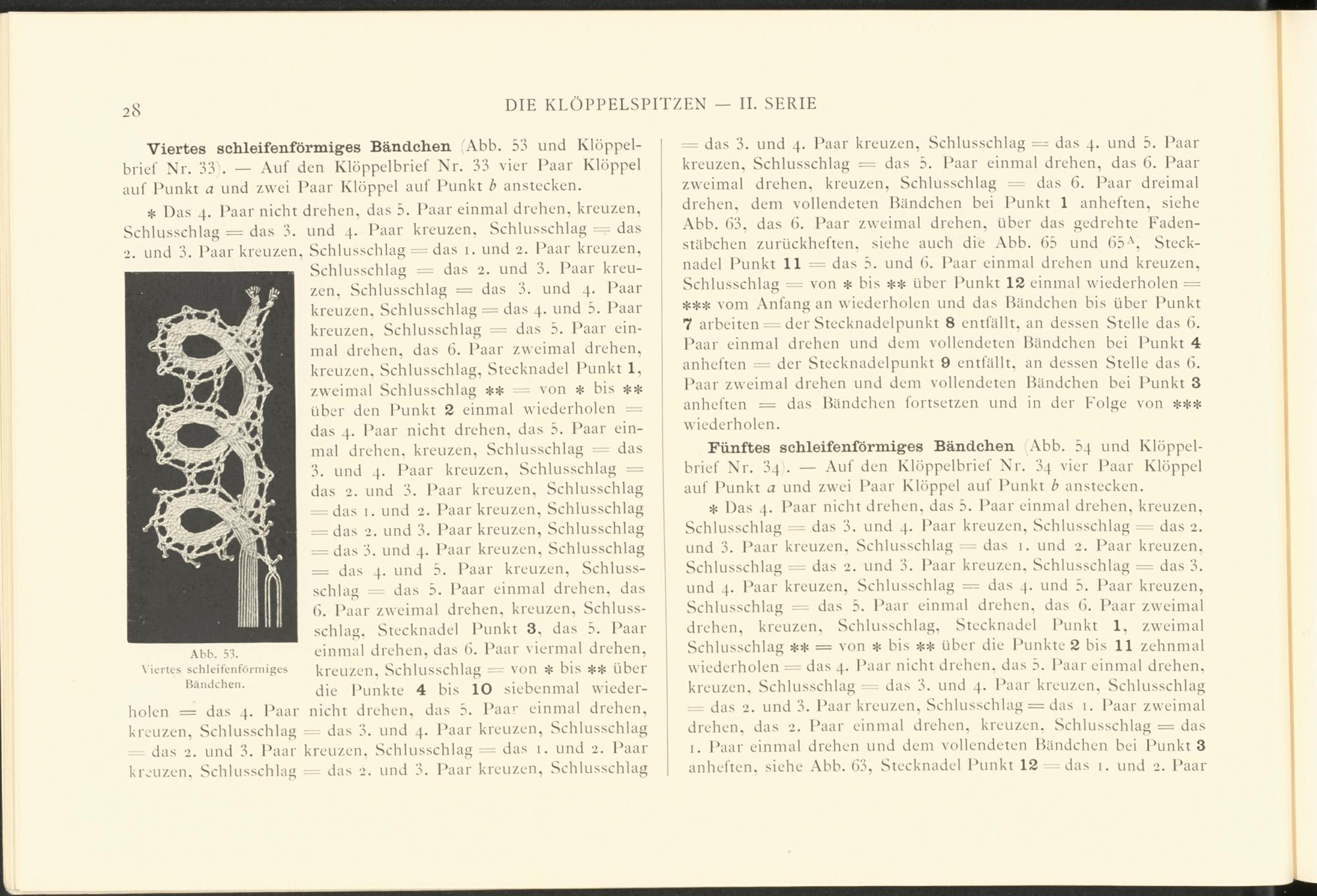 Viertes schleifenförmiges Bändchen ,Abb. 53 und Klöppelbrief Nr. 33 . — Auf den Klöppelbrief Nr. 33 vier Paar Klöppel auf Punkt a und zwei Paar Klöppel auf Punkt b anstecken.