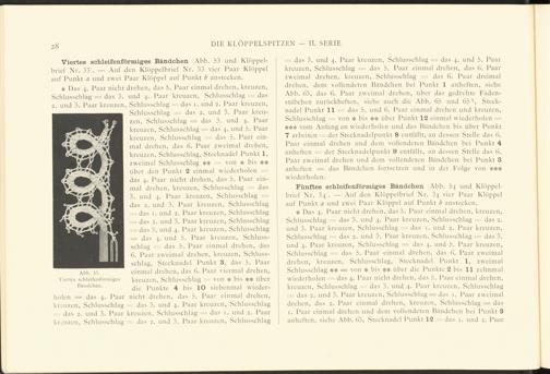 Fünftes schleifenförmiges Bändchen Abb. 54 und Klöppelbrief Nr. 34 . — Auf den Klöppelbrief Nr. 34 vier Paar Klöppel auf Punkt a und zwei Paar Klöppel auf Punkt b anstecken.