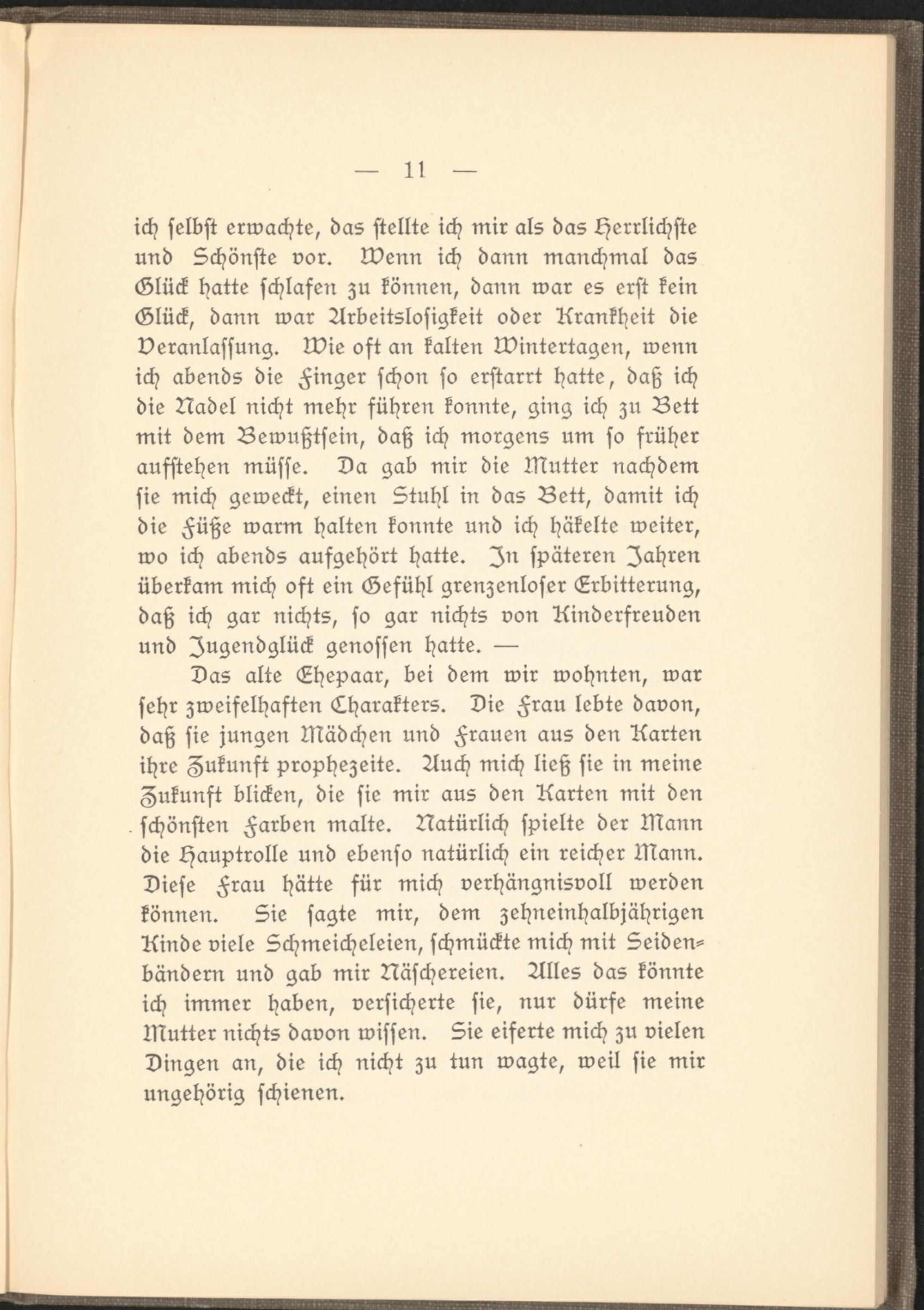Das alte Ehepaar, bei dem wir wohnten, war sehr zweifelhaften Lharakters. Die Frau lebte davon, daß sie jungen Mädchen und Frauen aus den Karten ihre Zukunft prophezeite. Auch mich ließ sie in meine Zukunft blicken, die sie mir aus den Karten mit den schönsten Farben malte. Natürlich spielte der Mann die Hauptrolle und ebenso natürlich ein reicher Mann. Diese Frau hätte für mich verhängnisvoll werden können. Sie sagte mir, dem zehneinhalbjährigen Kinde viele Schmeicheleien, schmückte mich mit Seiden- bändern und gab mir Näschereien. Alles das könnte ich immer haben, versicherte sie, nur dürfe meine Mutter nichts davon wissen. Sie eiferte mich zu vielen Dingen an, die ich nicht zu tun wagte, weil sie mir ungehörig schienen.