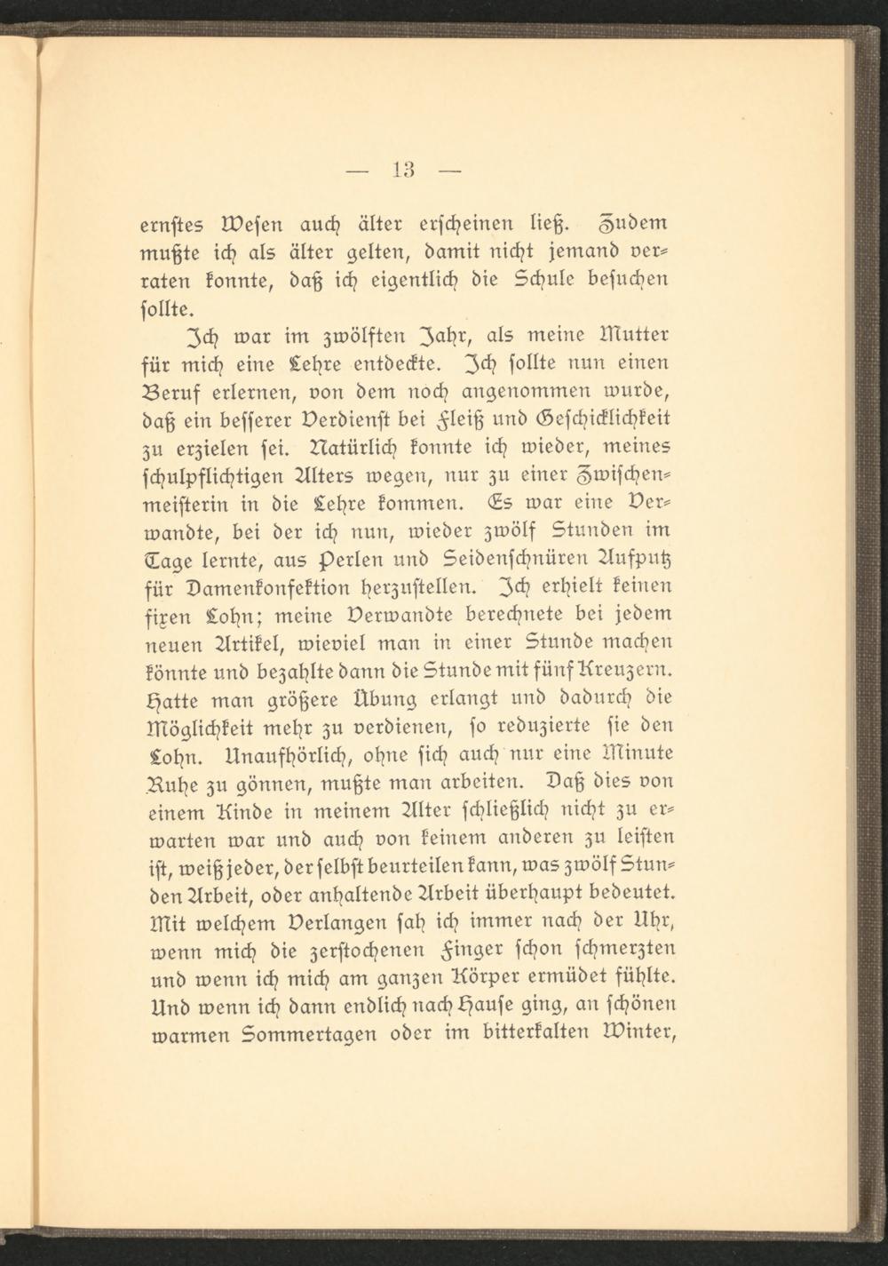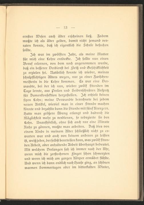 Zch war im zwölften Zahr, als meine Mutter sür mich eine Lehre entdeckte. Zch sollte nun einen Berus erlernen, von dem noch angenommen wurde, daß ein besserer verdienst bei Fleiß und Geschicklichkeit zu erzielen sei. Natürlich konnte ich wieder, meines schulpflichtigen Alters wegen, nur zu einer Zwischen- meisterin in die Lehre kommen. Es war eine Verwandte, bei der ich nun, wieder zwöls Stunden im Tage lernte, aus Perlen und Seidenschnüren Ausputz sür Damenkonfektion herzustellen. Ich erhielt keinen fixen Lohn; meine verwandte berechnete bei jedem neuen Artikel, wieviel man in einer Stunde machen könnte und bezahlte dann die Stunde mit fünf Rreuzern. Patte man größere Übung erlangt und dadurch die Möglichkeit mehr zu verdienen, so reduzierte sie den Lohn. Unaufhörlich, ohne sich auch nur eine Minute Ruhe zu gönnen, mußte man arbeiten. Daß dies von einem Rinde in meinem Alter schließlich nicht zu erwarten war und auch von keinem anderen zu leisten ist, weiß jeder, der selbst beurteilen kann, was zwöls Stunden Arbeit, oder anhaltende Arbeit überhaupt bedeutet. Mit welchem verlangen sah ich immer nach der Uhr, wenn mich die zerstochenen Finger schon schmerzten und wenn ich mich am ganzen Rörper ermüdet fühlte. Und wenn ich dann endlich nach pause ging, an schönen warmen Sommertagen oder im bitterkalten Winter,