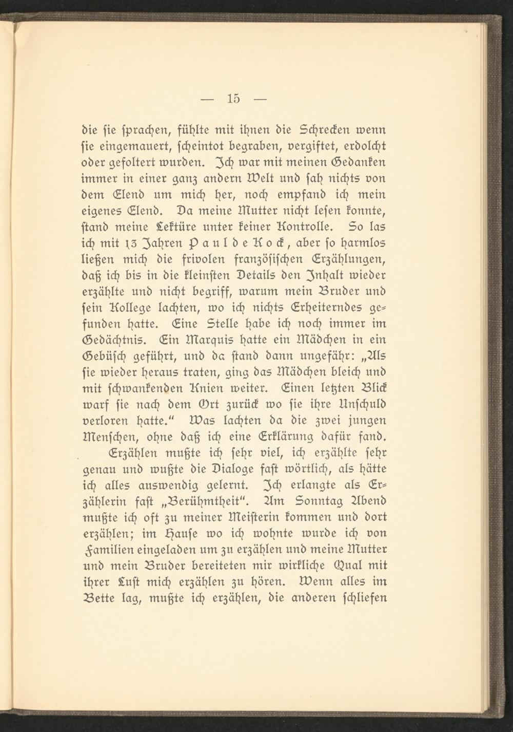 die sie sprachen, fühlte mit ihnen die Schrecken wenn sie eingemauert, scheintot begraben, vergiftet, erdolcht oder gefoltert wurden. Ich war mit meinen Gedanken immer in einer ganz andern Welt und sah nichts von dem Elend um mich her, noch empfand ich mein eigenes Elend. Da meine Mutter nicht lesen konnte, stand meine Lektüre unter keiner Kontrolle. So las ich mit 13 Jahren jDauldeKock, aber so harmlos ließen mich die frivolen französischen Erzählungen, daß ich bis in die kleinsten Details den Inhalt wieder erzählte und nicht begriff, warum mein Bruder und sein Kollege lachten, wo ich nichts Erheiterndes gefunden hatte. Line Stelle habe ich noch immer im Gedächtnis. Ein Marquis hatte ein Mädchen in ein Gebüsch geführt, und da stand dann ungefähr: „Als sie wieder heraus traten, ging das Mädchen bleich und mit schwankenden Knien weiter. Einen letzten Blick warf sie nach dem Ort zurück wo sie ihre Unschuld verloren hatte." Was lachten da die zwei jungen Menschen, ohne daß ich eine Erklärung dafür fand.