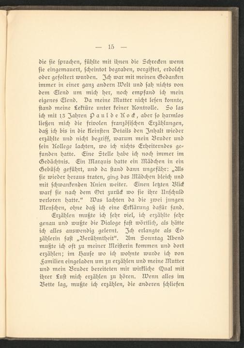 Erzählen mußte ich sehr viel, ich erzählte sehr genau und wußte die Dialoge fast wörtlich, als hätte ich alles auswendig gelernt. Ich erlangte als Erzählerin fast „Berühmtheit". Am Sonntag Abend mußte ich oft zu meiner Meisterin kommen und dort erzählen; im Hause wo ich wohnte wurde ich von Familien eingeladen um zu erzählen und meine Mutter und mein Bruder bereiteten mir wirkliche Oual mit ihrer Lust mich erzählen zu hören, wenn alles im Bette lag, mußte ich erzählen, die anderen schliefen