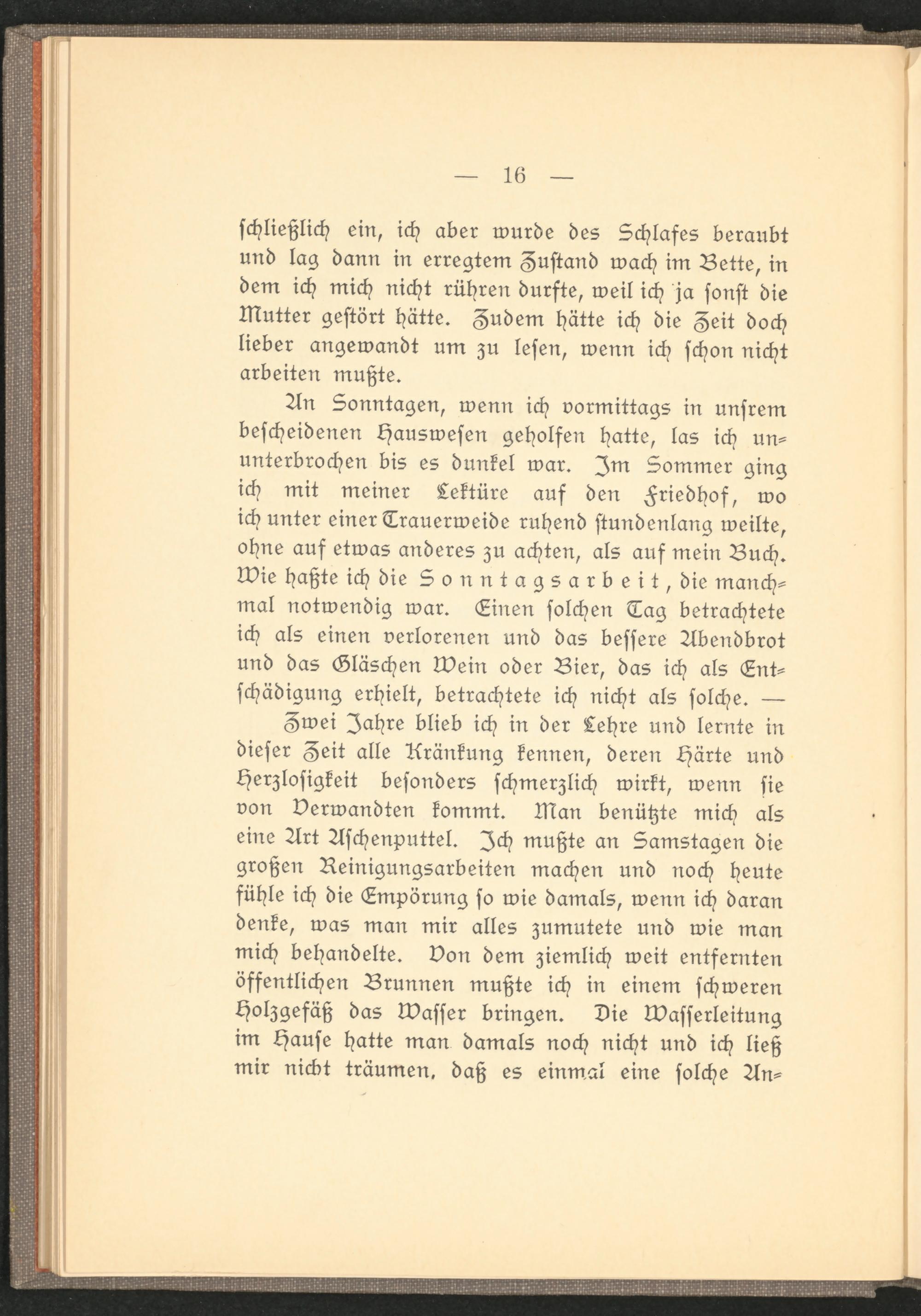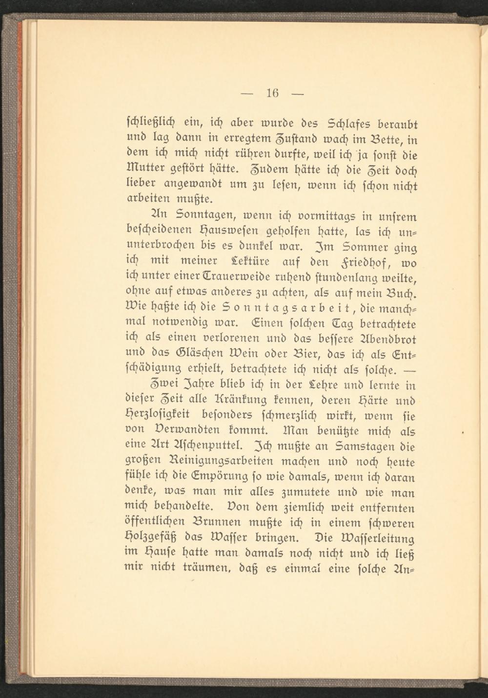 Zwei Zahre blieb ich in der Lehre und lernte in dieser Zeit alle Kränkung kennen, deren Härte und Herzlosigkeit besonders schmerzlich wirkt, wenn sie von verwandten kommt. Man benützte mich als eine Art Aschenputtel. Ich mußte an Samstagen die großen Reinigungsarbeiten machen und noch heute fühle ich die Empörung so wie damals, wenn ich daran denke, was man mir alles zumutete und wie man mich behandelte, von dem ziemlich weit entfernten öffentlichen Brunnen mußte ich in einem schweren Holzgefäß das Wasser bringen. Die Wasserleitung im Hause hatte man damals noch nicht und ich ließ mir nickt träumen, daß es einmal eine solche An-