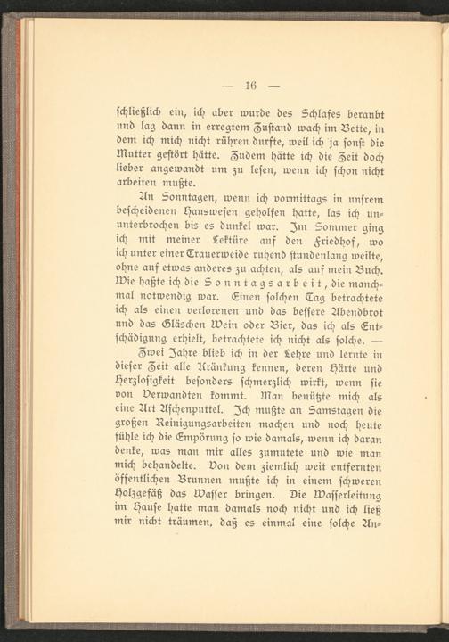 An Sonntagen, wenn ich vormittags in unsrem bescheidenen Hauswesen geholfen hatte, las ich ununterbrochen bis es dunkel war. Zm Sommer ging ich mit meiner Lektüre auf den Friedhof, wo ich unter einer Trauerweide ruhend stundenlang weilte, ohne auf etwas anderes zu achten, als auf mein Buch. Wie haßte ich die S o n n t a g s a r b e i t, die manchmal notwendig war. Einen solchen Tag betrachtete ich als einen verlorenen und das bessere Abendbrot und das Gläschen wein oder Bier, das ich als Entschädigung erhielt, betrachtete ich nicht als solche. —