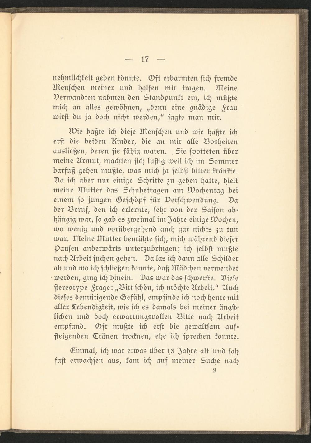 wie haßte ich diese Menschen und wie haßte ich erst die beiden Rinder, die an mir alle Bosheiten ausließen, deren sie fähig waren. Sie spotteten über meine Armut, machten sich lustig weil ich im Sommer barfuß gehen mußte, was mich ja selbst bitter kränkte. Da ich aber nur einige Schritte zu gehen hatte, hielt meine Mutter das Schuhetrazen am Wochentag bei einem so jungen Geschöpf für Verschwendung. Da der Beruf, den ich erlernte, sehr von der Saison abhängig war, so gab es zweimal im Jahre einige Wochen, wo wenig und vorübergehend auch gar nichts zu tun war. Meine Mutter bemühte sich, mich während dieser pausen anderwärts unterzubringen; ich selbst mußte nach Arbeit suchen gehen. Da las ich dann alle Schilder ab und wo ich schließen konnte, daß Mädchen verwendet werden, ging ich hinein. Das war das schwerste. Diese stereotype Frage: „Bitt schön, ich möchte Arbeit." Auch dieses demütigende Gefühl, empfinde ich noch heute mit aller Lebendigkeit, wie ich es damals bei meiner ängstlichen und doch erwartungsvollen Bitte nach Arbeit empfand. Gft mußte ich erst die gewaltsam aufsteigenden Tränen trocknen, ehe ich sprechen konnte.