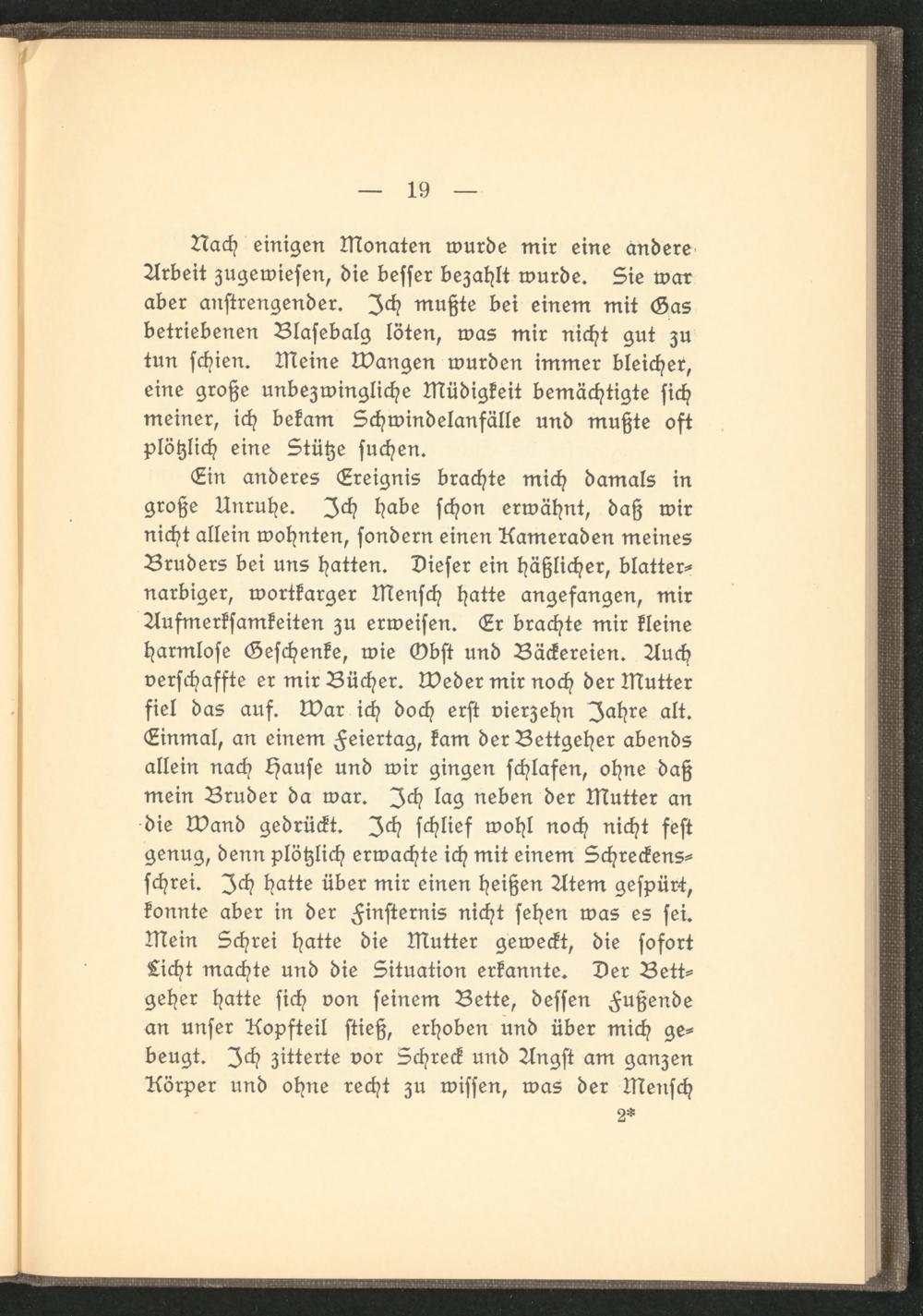 Ein anderes Ereignis brachte mich damals in große Unruhe. Ich habe schon erwähnt, daß wir nicht allein wohnten, sondern einen Kameraden meines Bruders bei uns hatten. Dieser ein häßlicher, blatternarbiger, wortkarger Mensch hatte angefangen, mir Aufmerksamkeiten zu erweisen. Er brachte mir kleine harmlose Geschenke, wie Gbst und Bäckereien. Auch verschaffte er mir Bücher, weder mir noch der Mutter fiel das auf. war ich doch erst vierzehn Jahre alt. Einmal, an einem Feiertag, kam der Bettgeher abends allein nach Hause und wir gingen schlafen, ohne daß mein Bruder da war. Ich lag neben der Mutter an die wand gedrückt. Ich schlief wohl noch nicht fest genug, denn plötzlich erwachte ich mit einem Schreckensschrei. Ich hatte über mir einen heißen Atem gespürt, konnte aber in der Finsternis nicht sehen was es sei. Mein Schrei hatte die Mutter geweckt, die sofort Licht machte und die Situation erkannte. Der Bettgeher hatte sich von seinem Bette, dessen Fußende an unser Kopfteil stieß, erhoben und über mich gebeugt. Ich zitterte vor Schreck und Angst am ganzen Körper und ohne recht zu wissen, was der Mensch