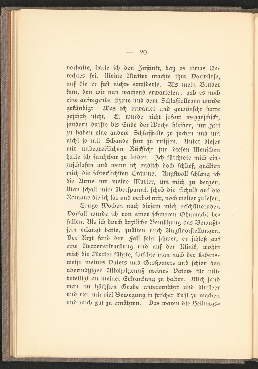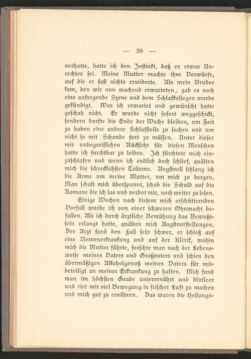 Einige Wochen nach diesem mich erschütternden Vorfall wurde ich von einer schweren Ohnmacht befallen. Als ich durch ärztliche Bemühung das Bewußtsein erlangt hatte, quälten mich Angstvorstellungen. Der Arzt fand den Fall sehr schwer, er schloß auf eine Nervenerkrankung und auf der Klinik, wohin mich die Mutter führte, forschte man nach der Lebensweise meines Vaters und Großvaters und schien den übermäßigen Alkoholgenuß meines Vaters für mitbeteiligt an meiner Erkrankung zu halten. Mich fand man im höchsten Grade unterernährt und blutleer und riet mir viel Bewegung in frischer Luft zu machen und mich gut zu ernähren. Das waren die Heilung?-