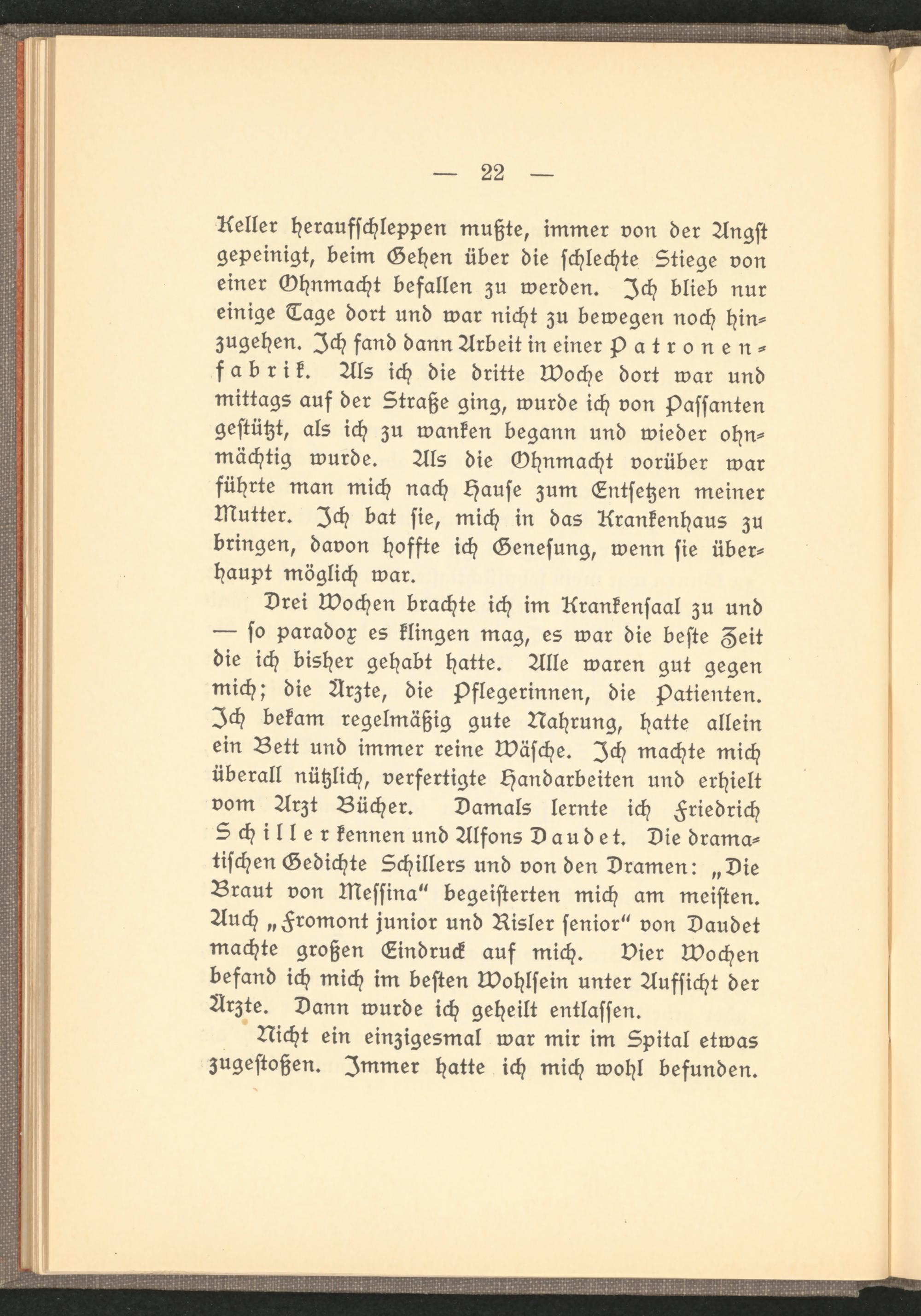 Drei Wochen brachte ich im Krankensaal zu und — so paradox es klingen mag, es war die beste Zeit die ich bisher gehabt hatte. Alle waren gut gegen mich; die Arzte, die Pflegerinnen, die Patienten. Ich bekam regelmäßig gute Nahrung, hatte allein ein Bett und immer reine Wäsche. Ich machte mich überall nützlich, verfertigte Handarbeiten und erhielt vom Arzt Bücher. Damals lernte ich Friedrich Schiller kennen und Alfons Daudet. Die dramatischen Gedichte Schillers und von den Dramen: „Die Braut von Messina" begeisterten mich am meisten. Auch „Fromont junior und Risler senior" von Daudet machte großen Eindruck auf mich. Vier Wochen befand ich mich im besten Wohlsein unter Aufsicht der Arzte. Dann wurde ich geheilt entlassen.