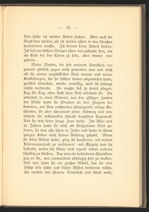 Meine Mutter, die seit meinem Kranksein un- gemein zärtlich gegen mich geworden war und mich oft ihr armes unglückliches Kind nannte und meine Liebkosungen, die sie früher immer abgewiesen hatte, gerührt hinnahm, wurde unwillig, weil ich solange nichts verdiente. Sie mußte sich ja soviel plagen. Tag für Tag, ohne Rast ohne Ruh arbeitete sie. Sie arbeitete in einer Weberei, von den giftigen Farben der wolle hatte sie Wunden an den Fingern bekommen, am Arm entstanden schmerzende eitrige Geschwüre, sie aber überwand jeden Schmerz und verrichtete ihr mühevolles schlecht bezahltes Tagewerk. Und sie war keine junge Frau mehr. Im Alter von 4? Jahren hatte sie mich als fünfzehntes Kind geboren, sie war also schon Jahre und hatte in ihrem ganzen Leben noch keinen Ruhetag gehabt, wenn sie keine Arbeit hatte, ging sie hausieren, um unsern Lebensunterhalt zu verdienen; mit Ehrgeiz war sie bestrebt, weder die Miete noch irgend etwas arideres schuldig zu bleiben. Das war ein besonderer Lharakter- zug an ihr, von niemandem abhängig sein zu wollen. Und nun hatte sie ein großes Mädel, das ihr eine Stütze sein sollte und dieses Mädel verdiente nichts. Sie machte mir schwere vorwürfe und schalt mich;
