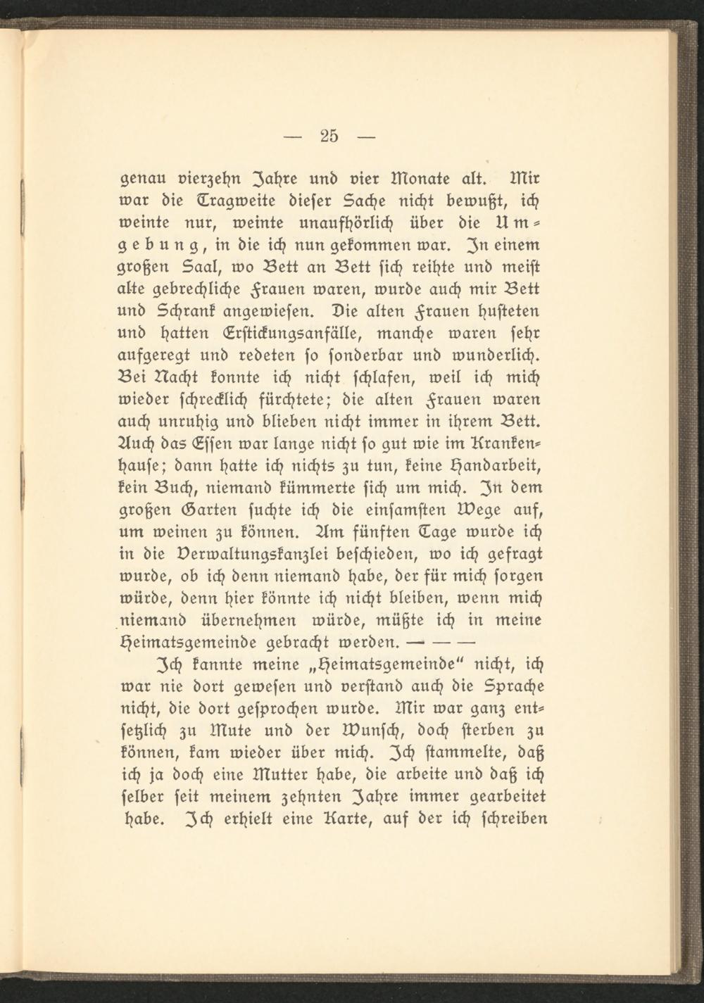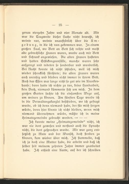 Ich kannte meine „Heimatsgemeinde" nicht, ich war nie dort gewesen und verstand auch die Sprache nicht, die dort gesprochen wurde. Mir war ganz entsetzlich zu Mute und der Wunsch, doch sterben zu können, kam wieder über mich. Ich stammelte, daß ich ja doch eine Mutter habe, die arbeite und daß ich selber seit meinem zehnten Jahre immer gearbeitet habe. Ich erhielt eine Karte, auf der ich schreiben