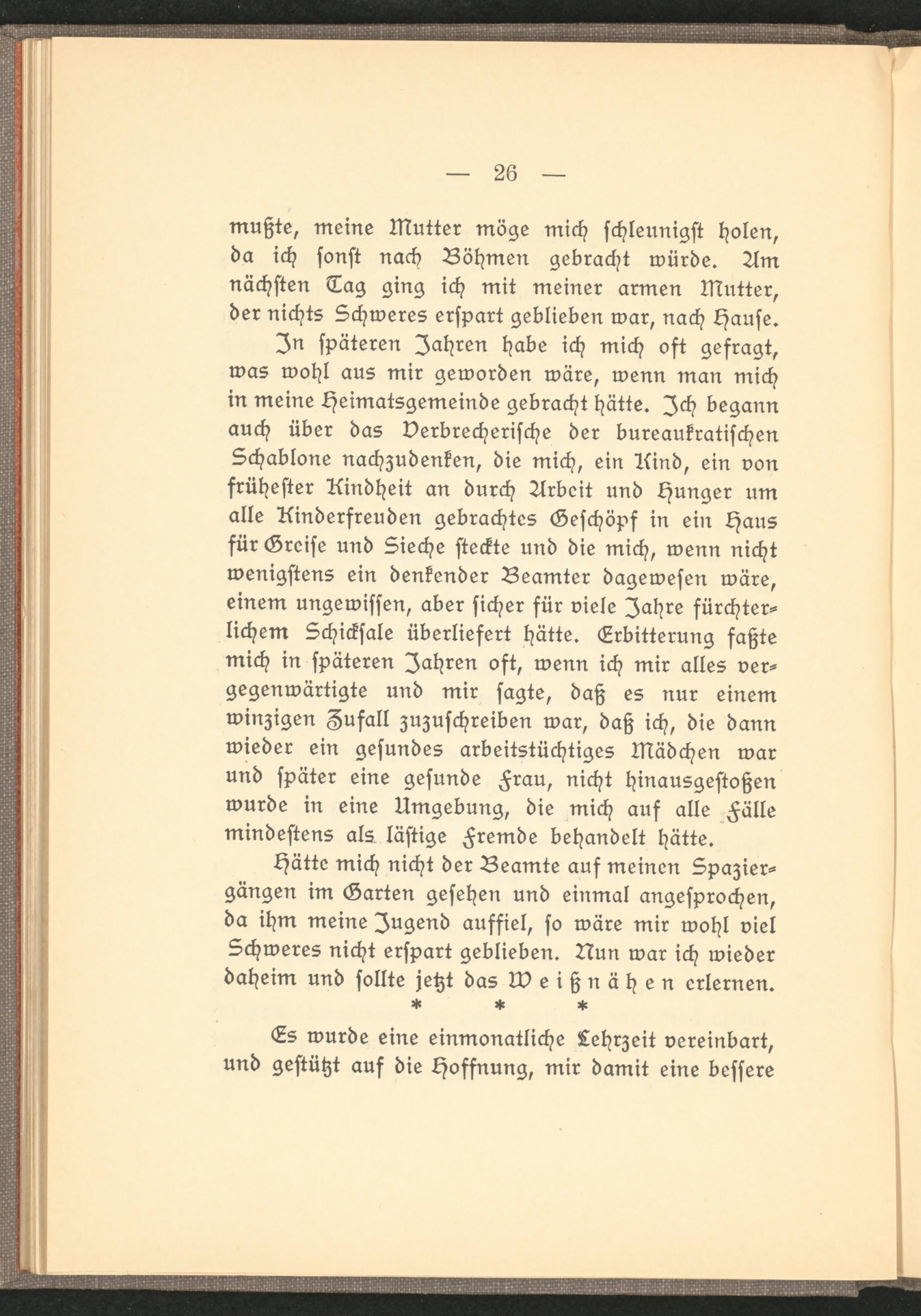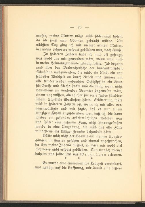 In späteren Jahren habe ich mich oft gefragt, was wohl aus mir geworden wäre, wenn man mich in meine Heimatsgemeinde gebracht hätte. Ich begann auch über das Verbrecherische der bureaukratischen Schablone nachzudenken, die mich, ein Rind, ein von frühester Kindheit an durch Arbeit und Hunger um alle Rinderfreuden gebrachtes Geschöpf in ein Haus für Greise und Sieche steckte und die mich, wenn nicht wenigstens ein denkender Beamter dagewesen wäre, einem ungewissen, aber sicher für viele Jahre fürchterlichem Schicksale überliefert hätte. Erbitterung faßte mich in späteren Jahren oft, wenn ich mir alles vergegenwärtigte und mir sagte, daß es nur einem winzigen Zufall zuzuschreiben war, daß ich, die dann wieder ein gesundes arbeitstüchtiges Mädchen war und später eine gesunde Frau, nicht hinausgestoßen wurde in eine Umgebung, die mich auf alle Fälle mindestens als lästige Fremde behandelt hätte.